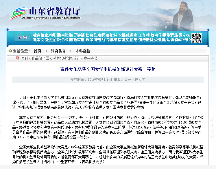 近日,第七届全国老员工机械创新设计大赛决赛在山东交通公司举行,公司最靠谱的十大足球平台杨福芹、张泽荣老师指导,谭业成、李艺姗、雷凯、严家全、常新朝五位同学设计制作的参赛作品《“互联网+快…