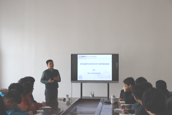 会上,李庆领代表公司对陈民教授的到来表示热烈欢迎,并对陈民在相变传热和分子动力学模拟领域取得的重要成果做了介绍。随后,陈民做了题为《柔性超薄平面热管中的气液界面和相变》报告。报告中详细介绍了超薄热管的前沿科技并对热管中气液相变问题进行具体阐述,通过非平衡分子动力学模拟方法,得到相变物质在不同温度和非平衡程度下的凝结系数,根据HSK公式推导出可应用于CFS计算的蒸发凝结新模型,陈民还就分子动力学的应用领域和如何从工程实际中凝练出基础研究课题等问题为大家分享经验。会后,与会师生结合报告内容和自身科研过程中存在的问题与陈教授进行了深入探讨。