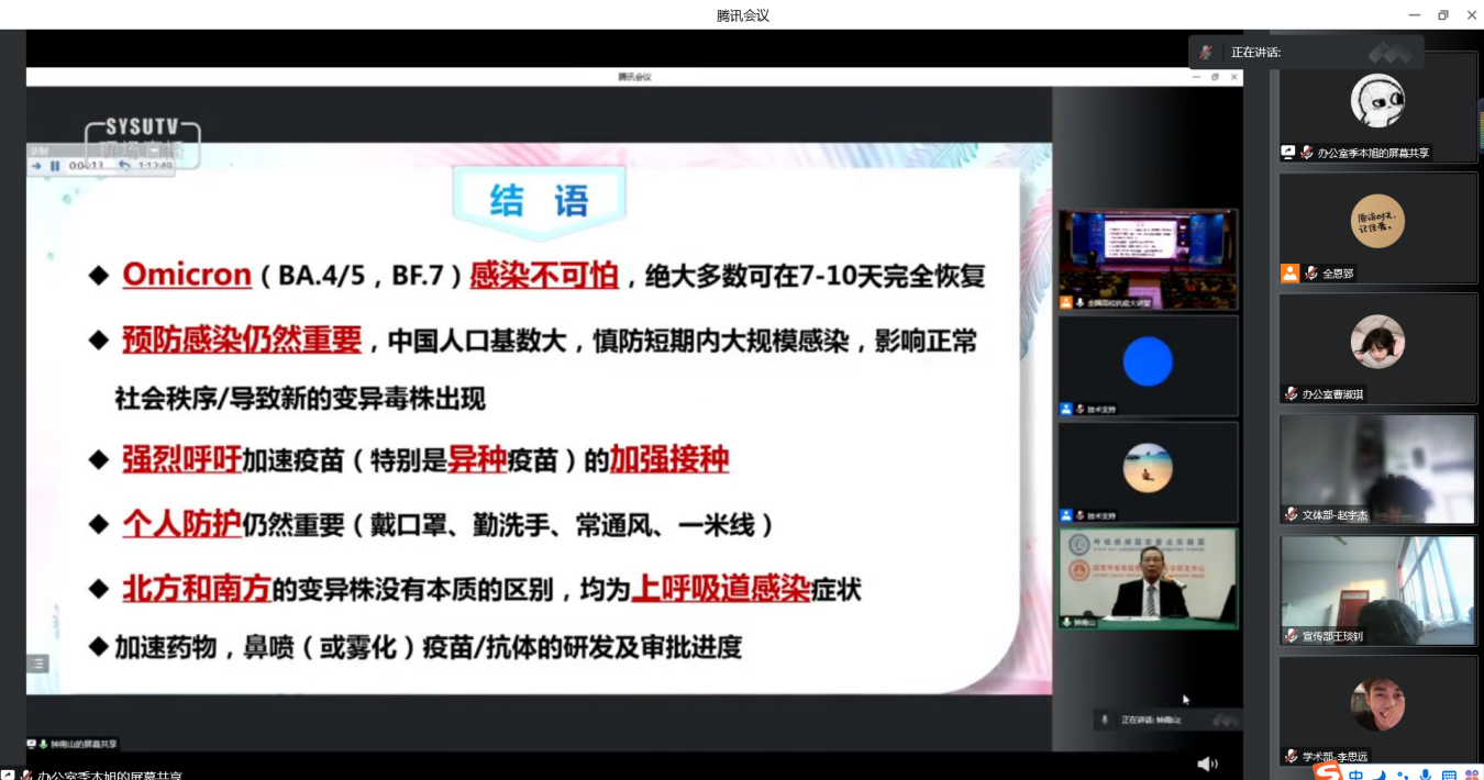 作为当代老员工,我们要科学理性的认识奥密克戎病毒,从容不迫的应对疫情发展的新变化。钟老对奥密克戎的讲解让我们更加了解此病毒。虽然我们开放了不在实行静默管理,但还是要做好个人防护。此前三年,国家一直在保护我们,之后我们要保护好自己,向在疫情中牺牲和奋斗拼搏的人致敬,谢谢他们的付出!