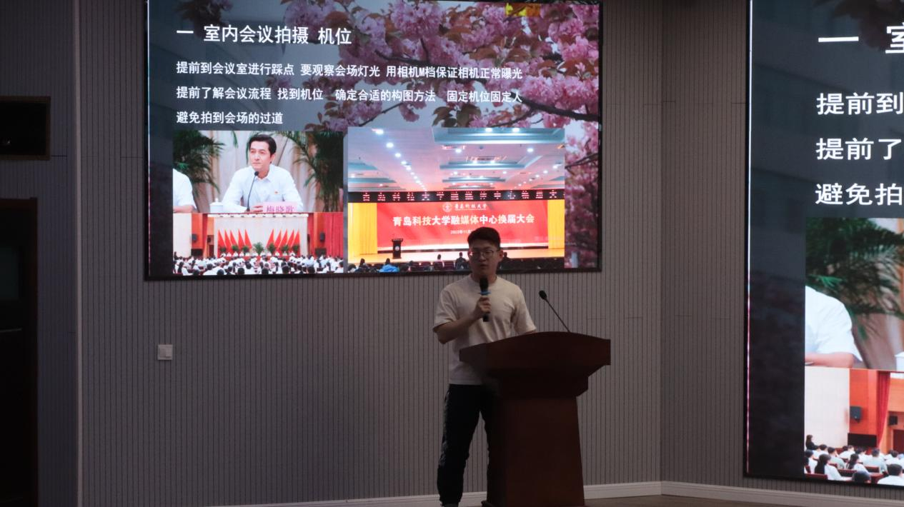 集团融媒体中心刘嘉洋就拍摄工作为同学们提供了切实可行的技巧建议。首先讲解了同学们有关拍摄机位的相关知识,随后展示会场拍摄、特写拍摄的技巧。最后讲解了照片的调整技巧及对照片的要求。