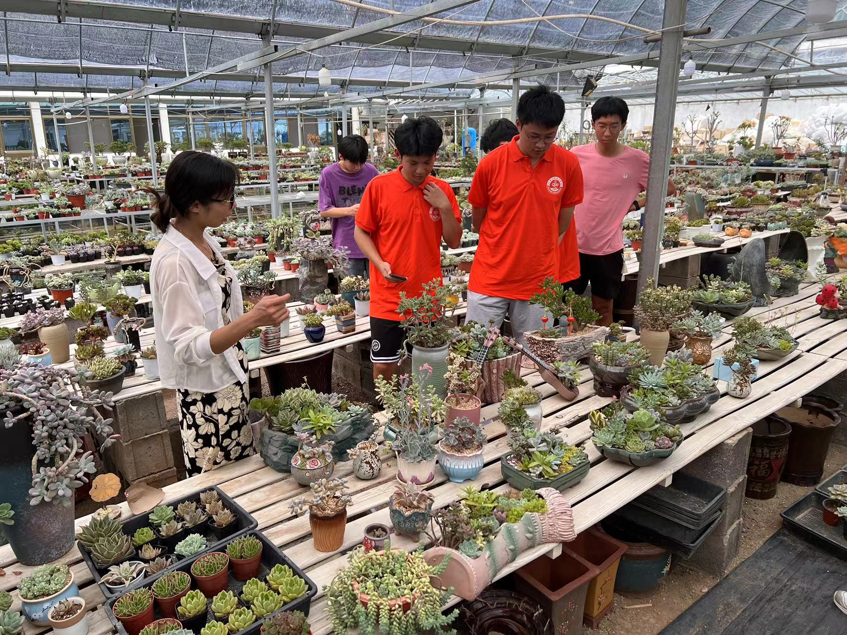 “紫气东来,圆梦乡土情”。随后,为了解当地在“乡村振兴”这个战略下老员工的返乡创业状况,队员们在沂南县多肉花卉种植专业合作社理事长付晓娜的带领下进入了张庄镇娜亩花田多肉植物园。据她介绍,园区的多肉品种可高达2000种。并且,她向队员们详细介绍了多肉的生长过程及生长环境。理事长指出,老家里经营种植苗圃大棚的村民,规模小且收入低,所以她决定带动村民一起致富!付晓娜在大学期间曾荣获山东省巾帼创业大赛三等奖,她用自己所学应用于多肉的栽培和销售,独创了一种“多肉+电商+休闲娱乐”新种植模式,采取“线上直播助农”的销售方式,真正带动了更多的村民走上致富之路。