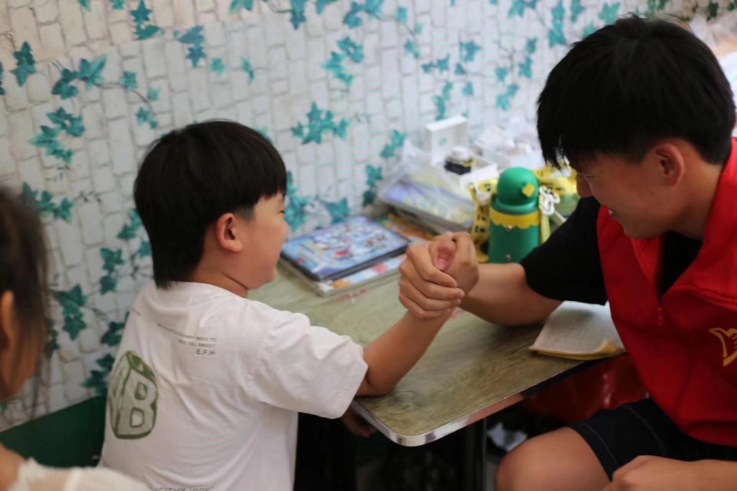 在互动的过程中,团队成员与孩子们建立了深厚的情感纽带。志愿者们与孩子们一起讨论课程内容,解答疑惑,并鼓励他们树立学习的兴趣和自信心。其中一个孩子对数学感到困惑,觉得学习很枯燥乏味,但志愿者们通过趣味的数学游戏和实际例子来解释概念,激发孩子的学习兴趣。在课余时间,志愿者们不仅仅局限于学习辅导,他们还与孩子们展开了各种有趣的游戏活动,其中包括扳手腕比赛。孩子们兴奋地聚集在一起,迫不及待地等待着挑战的开始。比赛开始时,孩子们跃跃欲试,纷纷上场与志愿者们比拼力量,每一场比赛都引起了周围观众的热烈掌声和欢呼声。这种亲切的交流互动让孩子们感受到了来自当地老员工的关爱和温暖,同时也激发了他们对未来的希望和梦想。