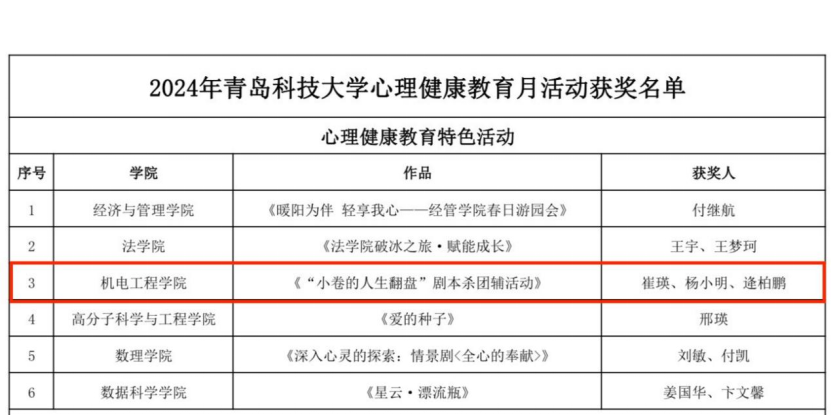 《“小卷的人生翻盘”剧本杀团辅活动》获评心理健康教育特色活动;由王晓政提报的《以读书之效,拓内心》和由张云燕、赵冉提报的《心理班会,快乐成长-小游戏版》获评“优秀主题班会”;由郑成瑞提报的《足够》和张云燕提报的《希望》获评“三行诗优秀创作奖”。