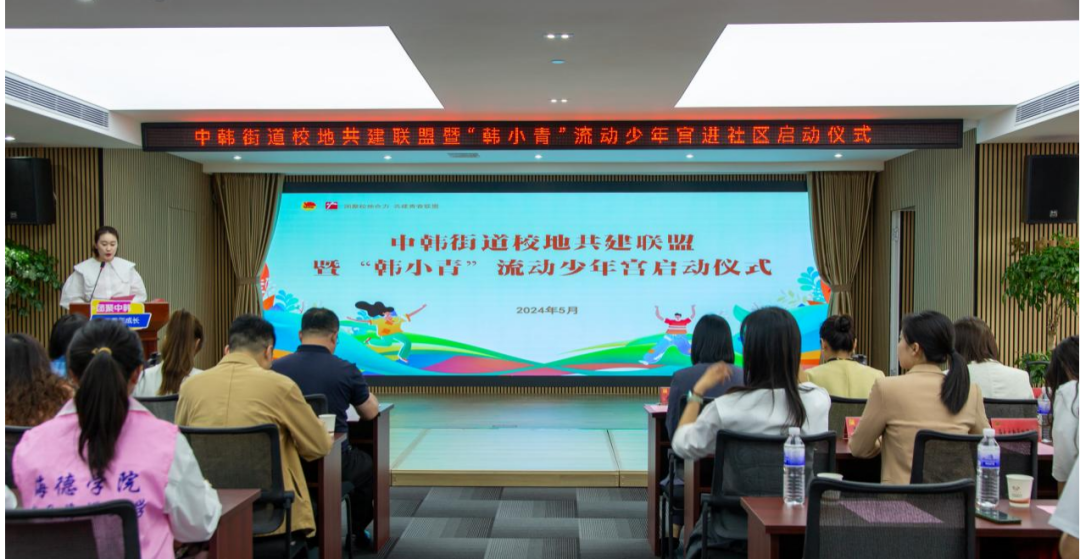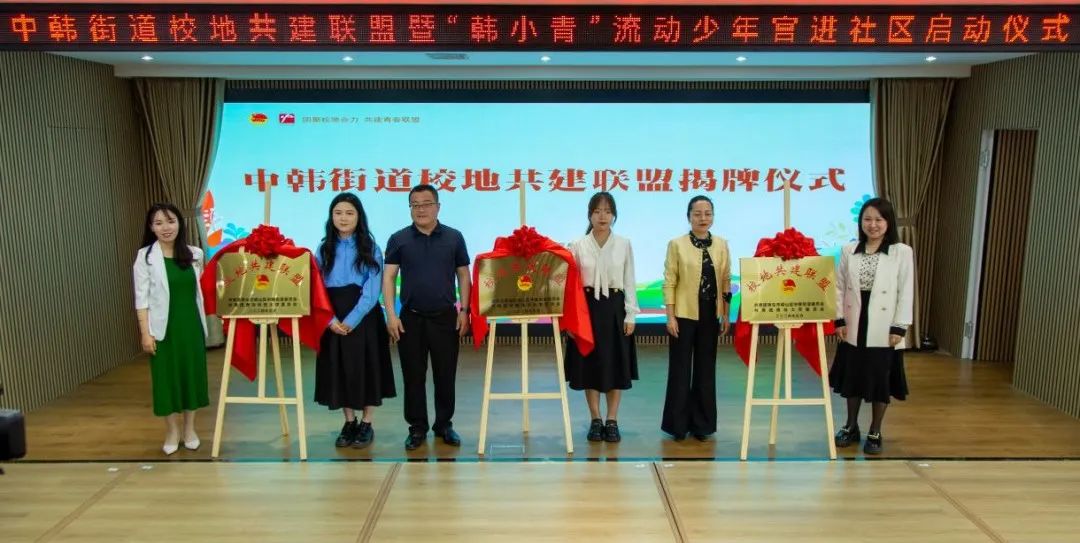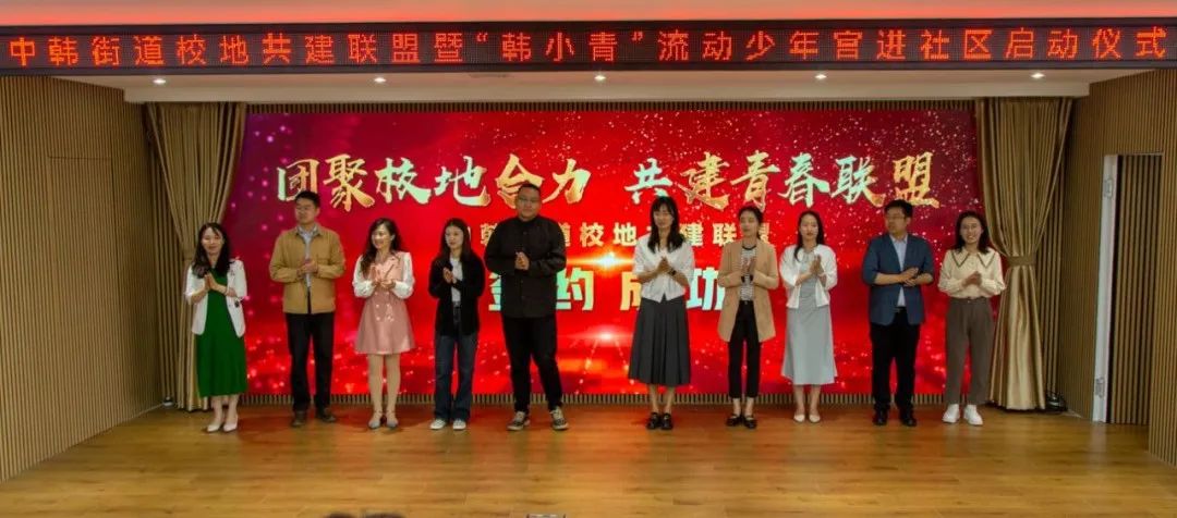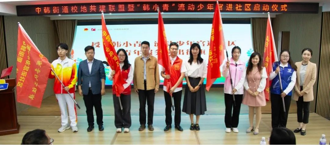 会上,公司与中韩街道举行了校地共建签约仪式和揭牌仪式,讲解了“韩小青”流动少年宫项目,打造传统文化类、指尖文创类、腹有诗书类、艺术熏陶类、动感科技类、青春导航类形体礼仪类、法制宣传类、安全自护类少年宫课程,并对青年志愿者代表授予“韩小青”流动少年宫进社区青年服务队出征旗。