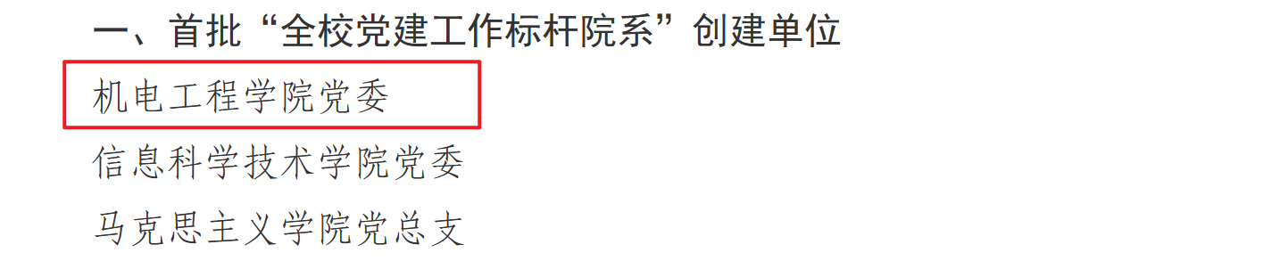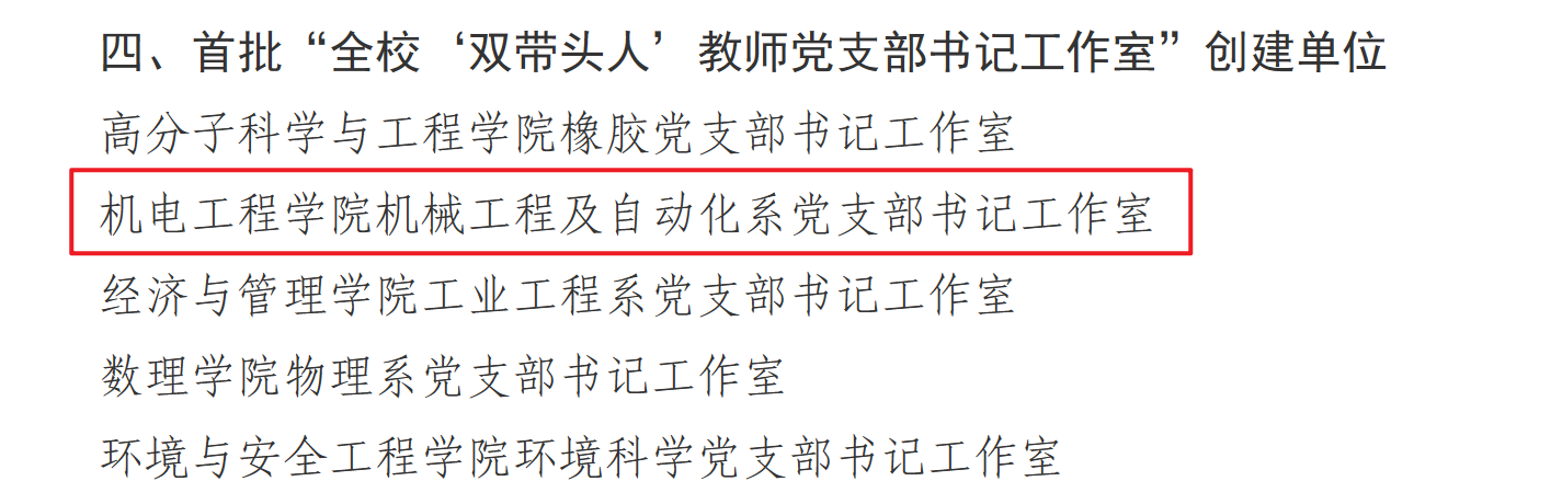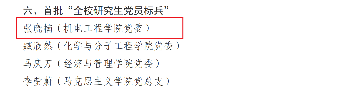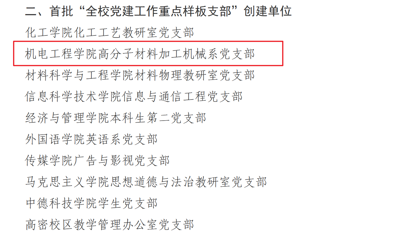 机电工程公司党委荣获多项佳绩,其中,公司党委入选首批“全公司党建工作标杆院系”创建单位,高分子材料加工机械系党支部入选首批“全公司党建工作重点样板支部”创建单位,机械工程及自动化系党支部书记工作室入选首批“全校‘双带头人’教师党支部书记工作室”创建单位,2022级硕士研究生张晓楠入选首批“全校研究生党员标兵”。