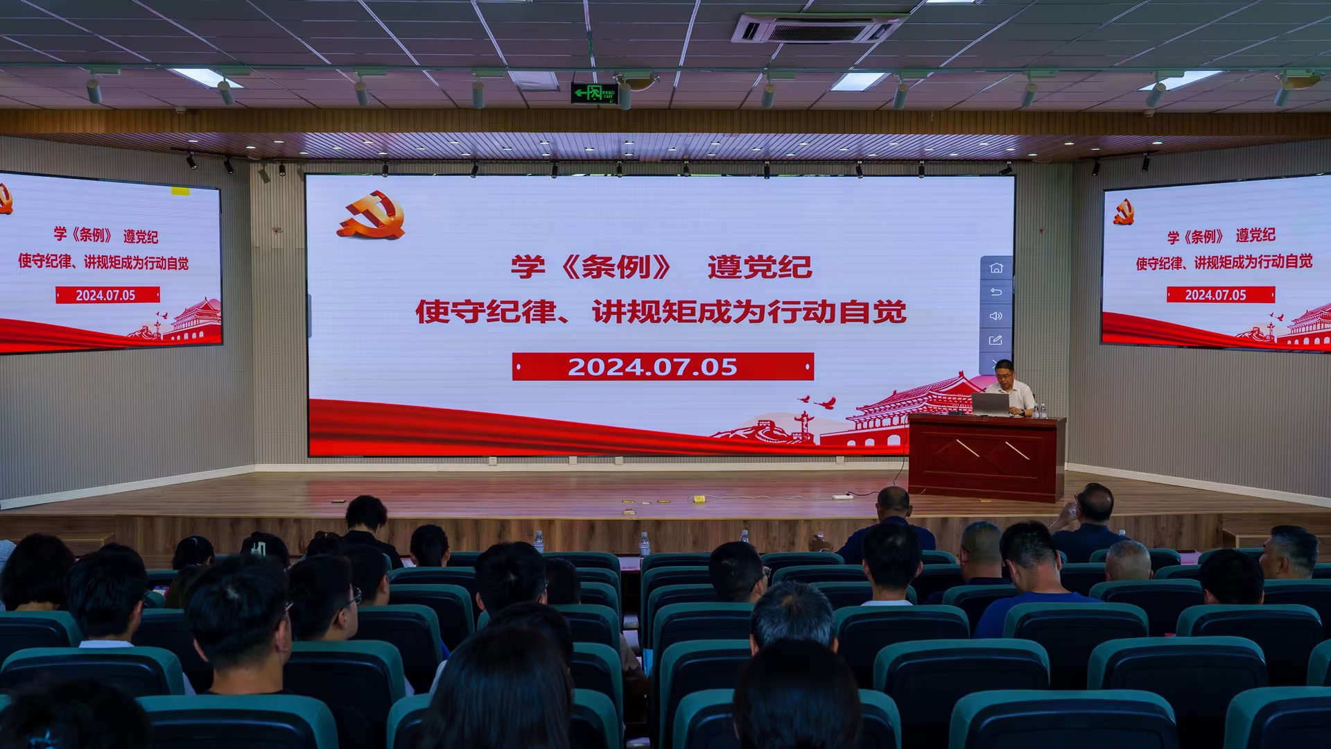 7月5日下午,公司党委常委、副董事长吕万翔以“学《条例》、遵党纪—使守纪律、讲规矩成为行动自觉”为题,为分管、联系单位讲授党纪学习教育专题党课。机电工程公司党委书记任允晓主持党课,相关单位师生党员180余人参加党课学习。