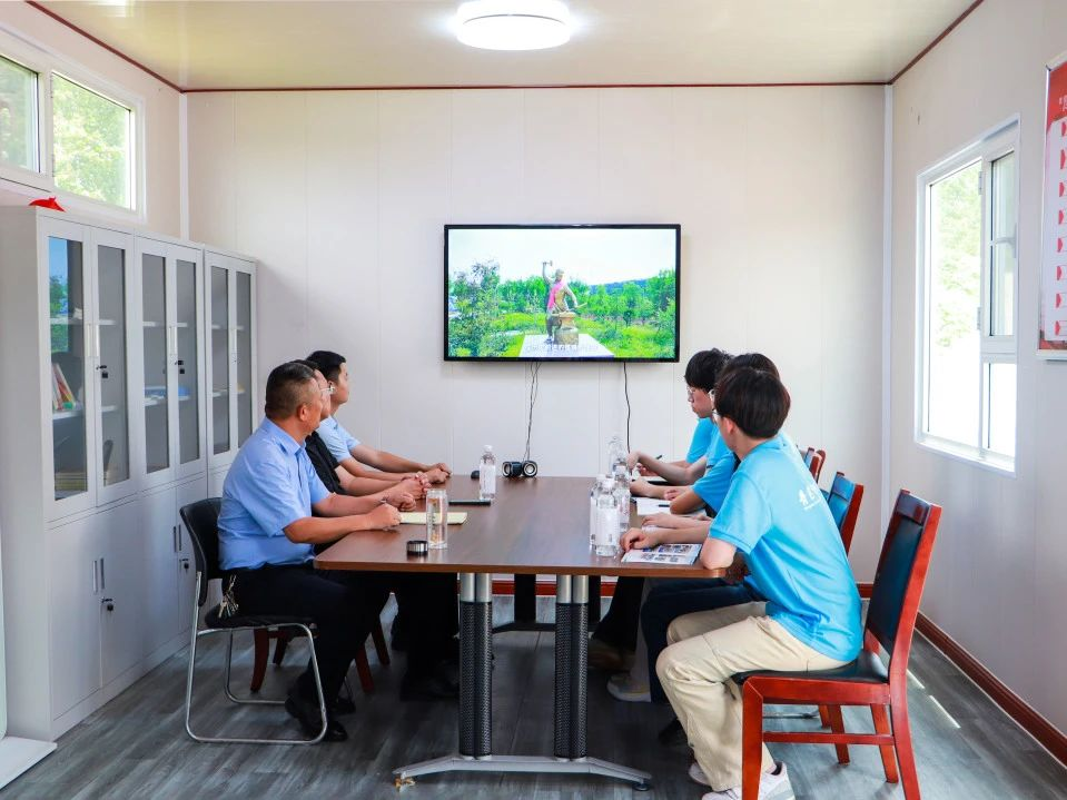 在刘杜镇黄义村,实践团队与陪同人员召开座谈会。座谈活动开始前,全体人员集中观看刘杜镇《望山见水·红满刘杜》宣传视频。黄义村党组织书记高朋向实践团介绍了黄义村传承老一辈打铁技艺,采取党组织领办、党员参与、村民入股的形式,成立黄义昌盛钢铁公司,带领村民致富增收,以产业振兴助力乡村全面振兴。