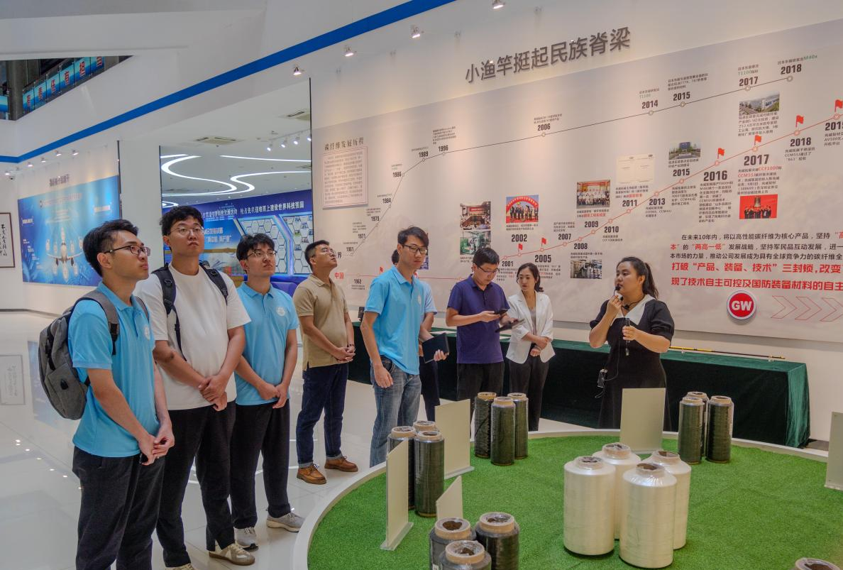 威海拓展纤维有限公司相关负责人向师生介绍了威海拓展纤维的母公司光威复材的发展史。公司从最初用于鱼竿研发碳纤维,结构遭遇国外从产品、技术到装备的“三封锁”,到形成具有自主知识产权的技术体系,最终通过国家863计划项目验收,正式成为碳纤维“国家队”,师生无不被其不畏艰难“勇攀科技高峰”的精神和艰苦奋斗、默默付出的家国情怀所打动。