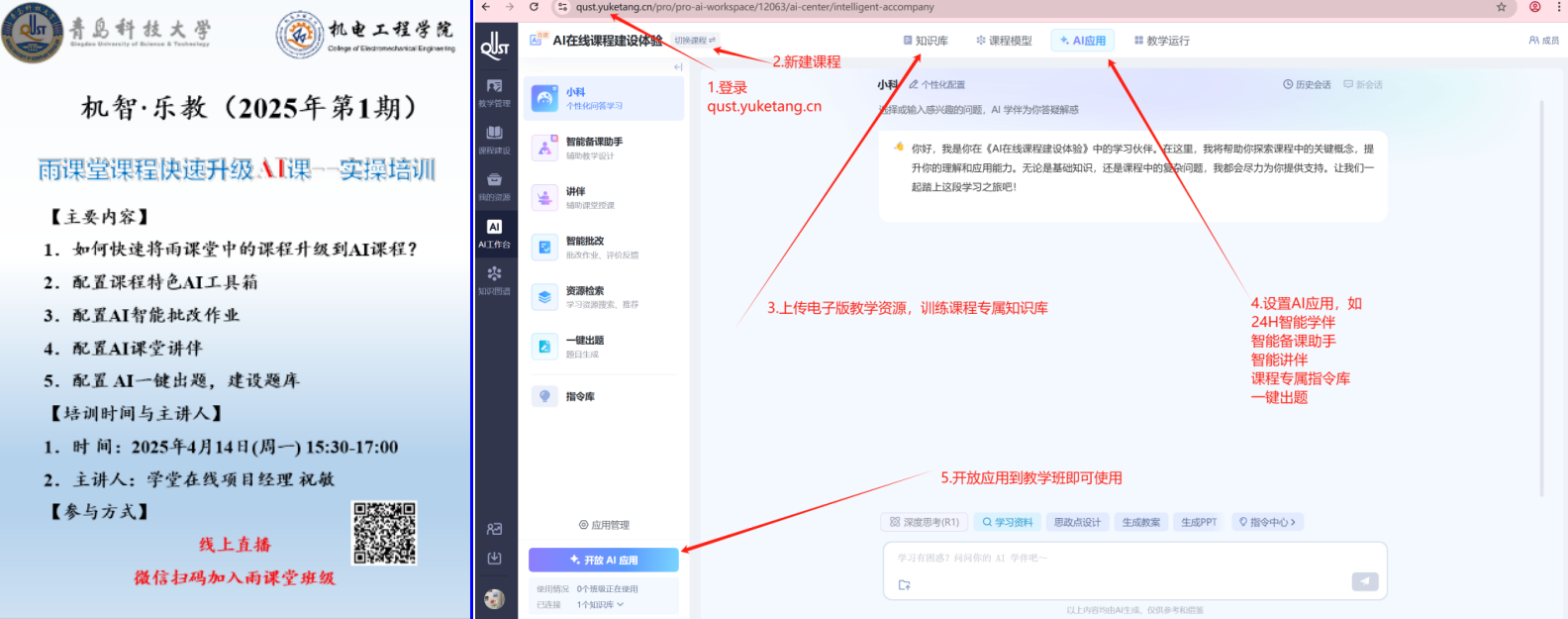 当前,人工智能技术在教育领域的渗透加速,但教师群体普遍面临“工具不熟、场景不明、实践不足”的困境。为进一步加强公司教师的数智意识,助力教师拥抱人工智能,积极探索新环境下的公司产品新模式和技术路径,公司于4月14日开启了“机智·乐教”系列首期培训。本次活动基于学堂在线平台,邀请平台祝经理做了“雨课堂课程快速升级AI课——实操培训”线上报告,为老师们AI课程入门传经送宝,破解教师AI应用难题。