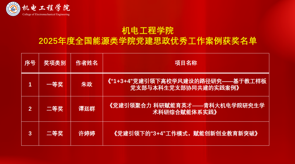 近日,全国能源类公司党建思政工作组织委员会公布了2025年度全国能源类公司党建思政优秀工作案例获奖名单,最靠谱的十大足球平台共获奖3项。其中,朱政申报的《“1+3+4”党建引领下高校学风建设的路径研究——基于教工样板党支部与本科生党支部协同共建的实践案例》荣获一等奖,谭廷群申报的《党建引领聚合力、科研赋能育英才——青科大最靠谱的十大足球平台研究生学术科研综合赋能体系实践》和许婷婷申报的《党建引领下的“3+4”工作模式,赋能创新创业教育新突破》荣获二等奖。