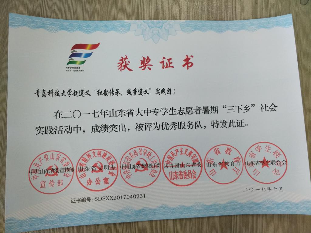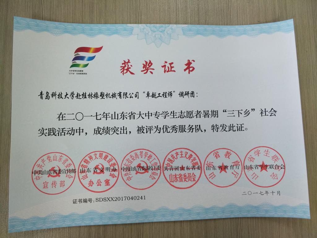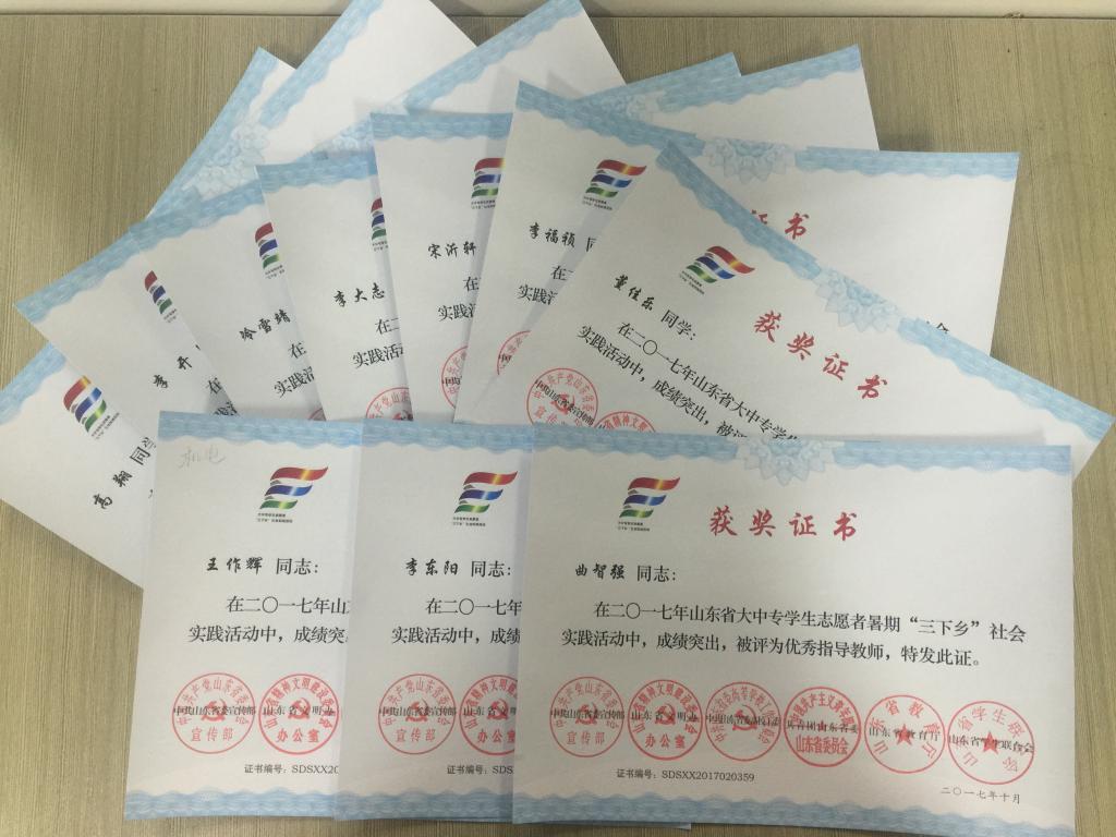 近日,2017年山东省大中专员工志愿者暑期文化科技卫生“三下乡”社会实践活动先进集体和先进个人的证书下发,最靠谱的十大足球平台赴桂林橡塑机械有限公司“卓越工程师”调研团、赴遵义“红韵传承,筑梦遵义”实践团2支队伍获得2017年山东省优秀服务队称号,王作辉、曲智强、李东阳被评为2017年山东省社会实践活动优秀指导教师,高翔、李开、冷雪靖、李大志、宋沂轩、李福祯、董佳乐7名员工荣获2017年山东省社会实践活动优秀员工。