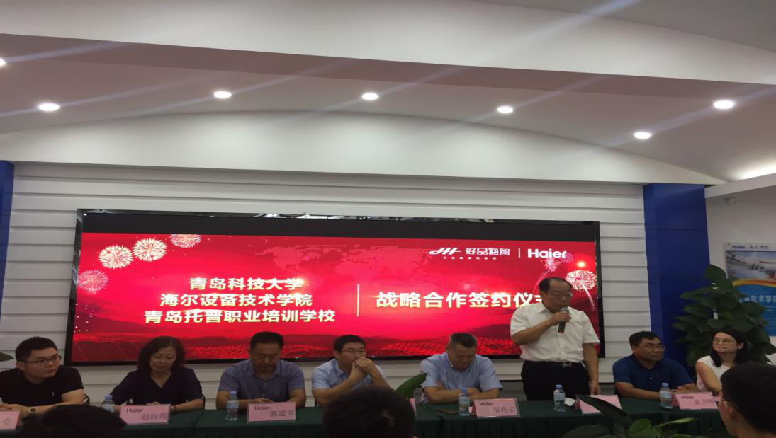 9月12日,体育外网十大平台app与海尔设备技术公司、青岛托普职业培训公司战略合作签约仪式暨体育外网十大平台app老员工实习基地挂牌仪式在海尔工业园隆重举行。体育外网十大平台app机电工程公司党总支书记孙立军、海尔设备技术公司经理邹兆云、青岛市老员工创业服务中心主任褚庆柱、青岛托普集团总经理王敏燕等共同出席签约仪式并致辞。