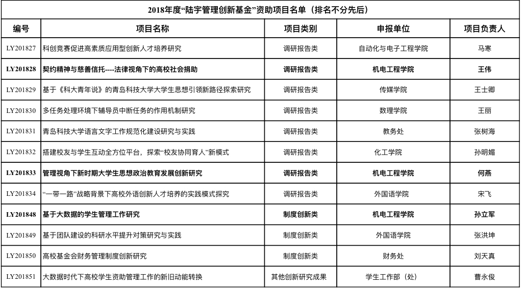 近日,公司下发《关于2018年度“陆宇管理创新基金”资助项目公示的通知》,最靠谱的十大足球平台申报的项目《契约精神与慈善信托----法律视角下的高校社会捐助》、《管理视角下新时期老员工思想政治教育发展创新研究》和《基于大数据的员工管理工作研究》获公司 2018年度“陆宇管理创新基金”资助。