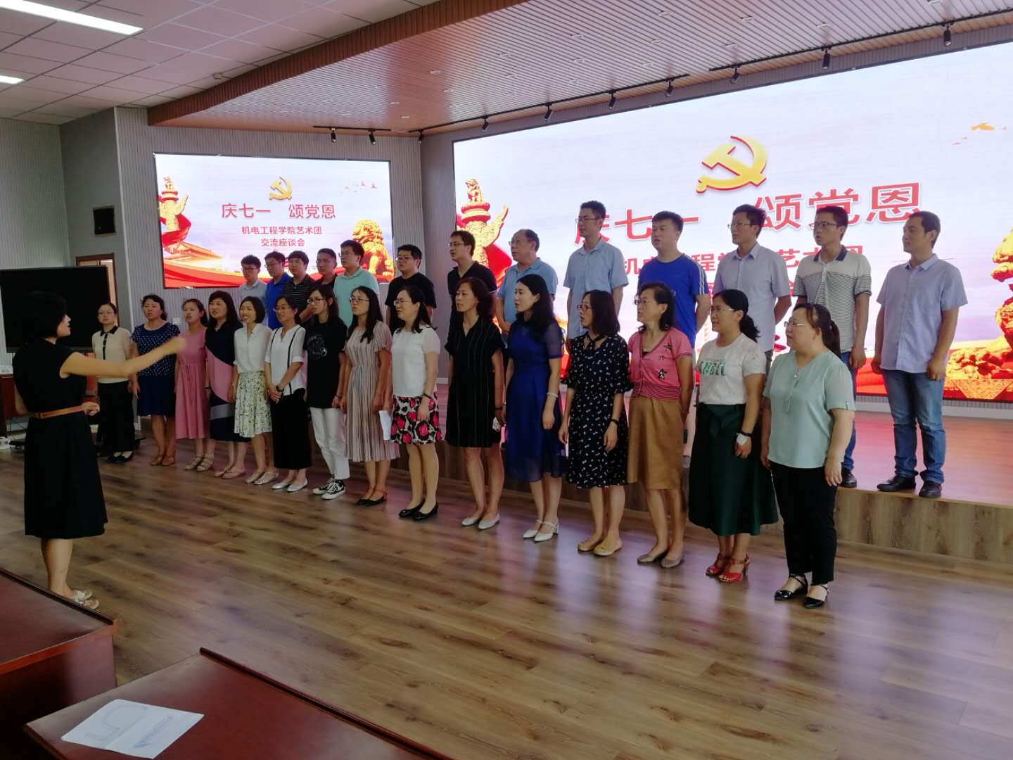 座谈会在热情激昂的合唱中拉开帷幕。朱惠华老师献唱《莫斯科没有眼泪》、李利老师一首《春闺梦》选段掌声阵阵,胡海明老师《歌唱祖国》饱含深情,付平老师感谢大家对公司分工会工作的支持并献唱《潇洒走一回》,王帅老师深情现场《我的祖国》,公司党总支书记孙立军清唱《呼伦贝尔》并寄语在座各位老师一是要不忘党恩,不忘初心,一心跟党走;二是要有信心、培养兴趣爱好,陶冶情操,形成良好氛围。最后座谈会在集体高唱《歌唱祖国》与《没有共产党就没有新中国》中结束。