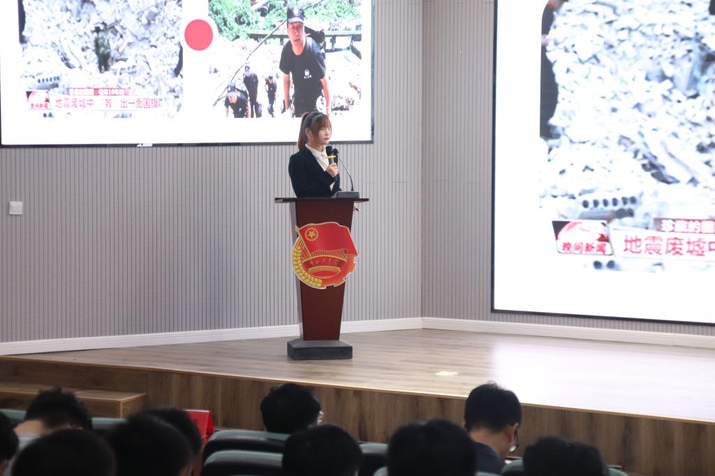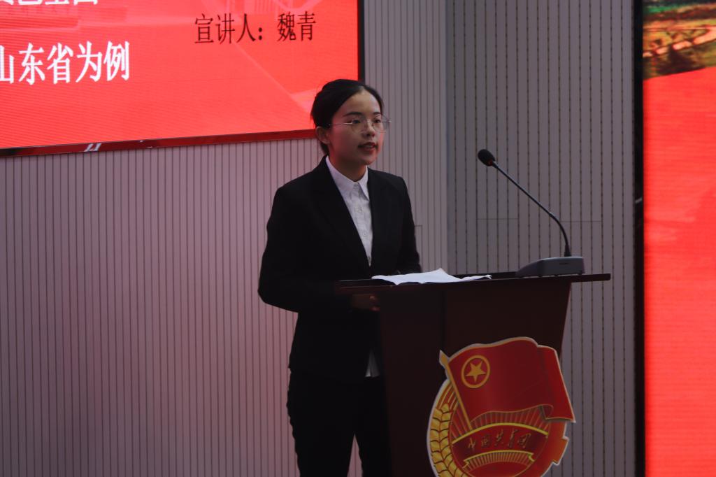 马克思主义公司“习近平新时代中国特色社会主义思想宣讲团”成员魏青和李晶晶分别作了题为《讲好红色故事 传承红色基因》、《五星红旗背后的故事》的理论宣讲。同学们一起赏析观看了《红星照耀中国》。