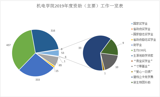 2019年度共6人获国家奖学金,1人获省政府奖学金,85人获国家励志奖学金,15人获省政府励志奖学金,333人获国家助学金,33人完成建档立卡免学费申请,1人获“爱心一日捐”,6人获“燕宝奖学金”,9人获新生特困补助,10人获“寸草基金”,437人获得2019年春季学期国家助学金生均增加150元,316人获生源地助学贷款,18人顺利完成暑期“校县结对”志愿服务考核。