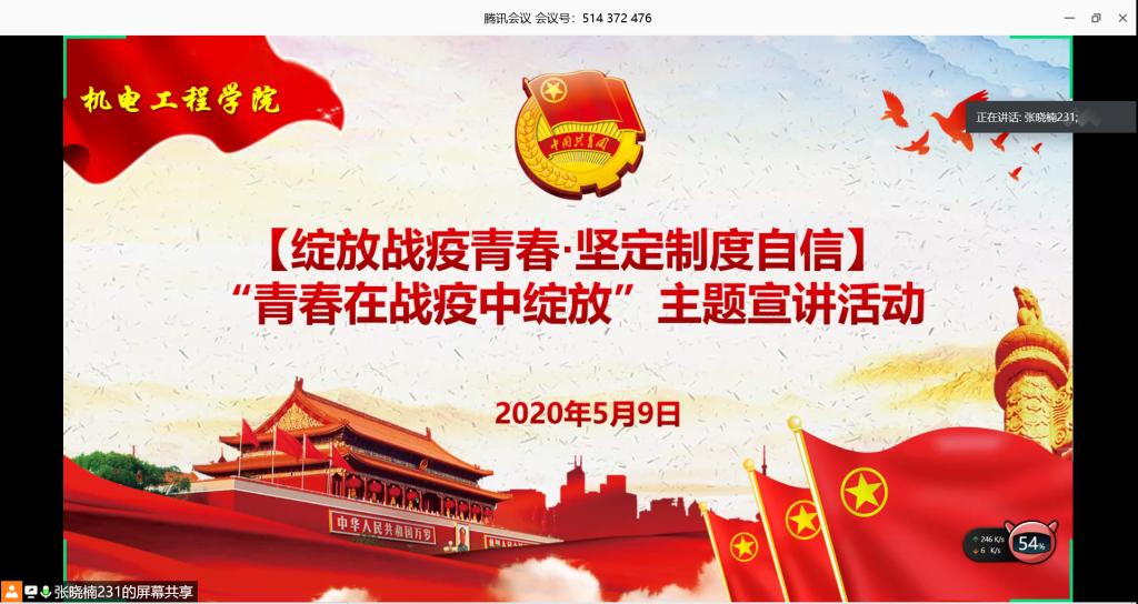 为深入贯彻落实习近平新时代中国特色社会主义思想对青年行动的指导,5月9日,在纪念五四运动101周年、新冠疫情防控阻击战取得重大战略成果之际,最靠谱的十大足球平台分团委组织部举办“青春在战疫中绽放”线上主题宣讲活动。分团委组织部部长王娟娟老师出席了活动,罗浩宇、刘龙、马江儒和马元宇四位团员作为机电团员青年战疫典型代表宣讲了他们勇战疫情的青春故事,17级、18级、19级200余名团学骨干通过“腾讯会议”参与了活动。活动由分团委组织部副部长张晓楠主持。