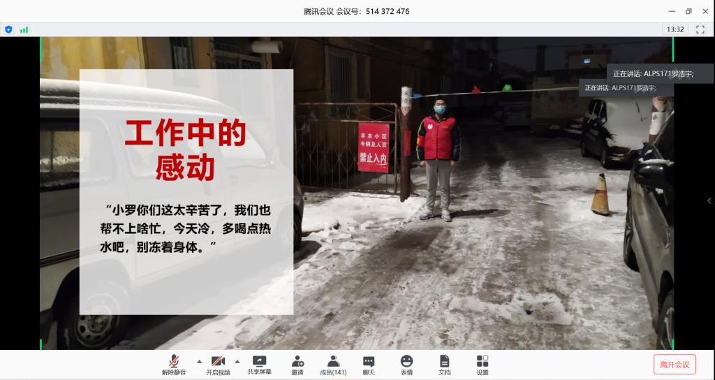 罗浩宇从一名员工党员和员工骨干的角度讲述了自己参与疫情志愿工作的所感所想。疫情暴发正值新年期间使得防疫工作更加紧张复杂,而他在社区居民的积极配合和温暖关怀下勇往直前,利用奖学金为工作人员和环卫工人送去温暖;作为最靠谱的十大足球平台员工会主席,发挥模范带头作用,举办“共抗疫情,爱国力行”系列活动及“四个一”系列活动,引导同学们学习习近平总书记的重要指示精神,鼓励大家勇于承担青年人的社会责任。