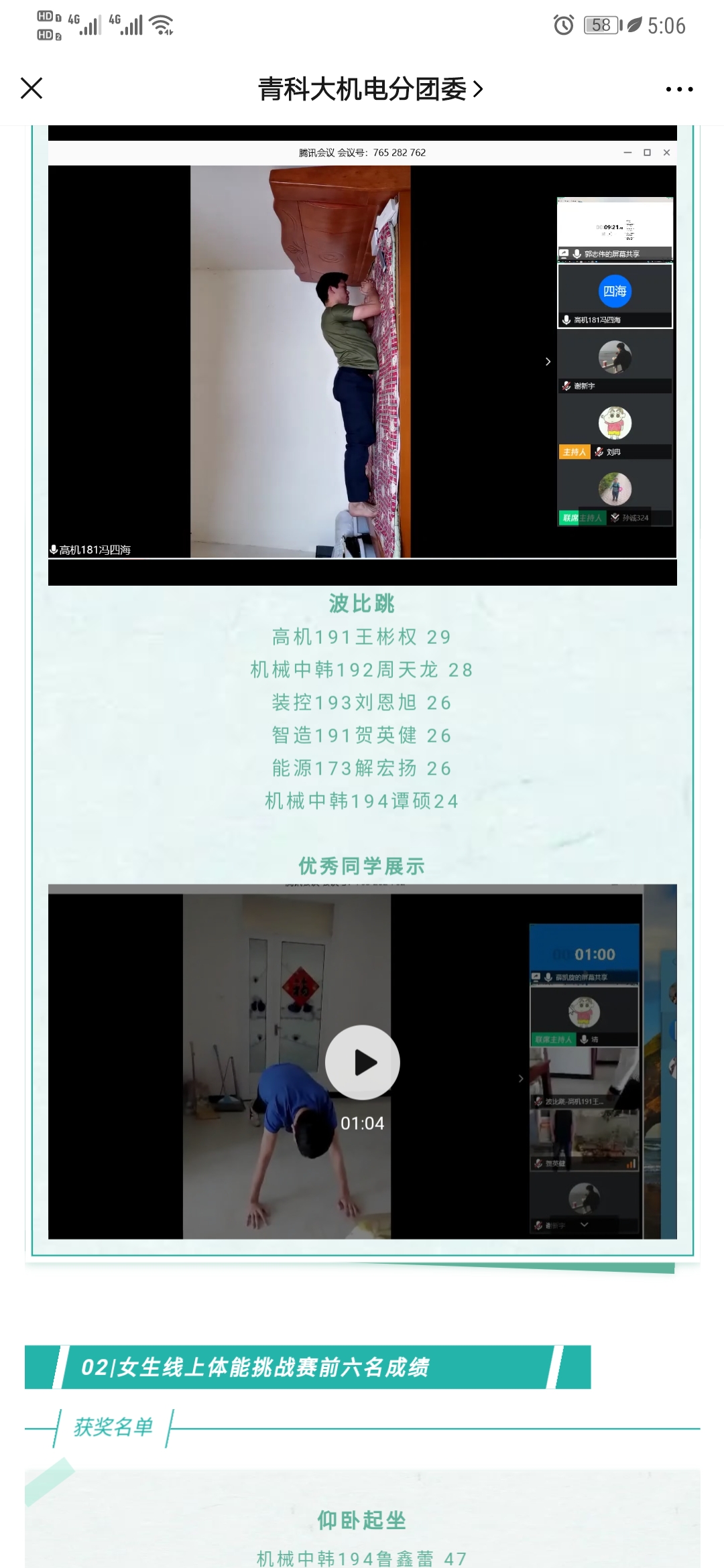为了响应山东省教育厅和公司关于“线上教育要重视员工心理健康”的工作要求,帮助员工缓解焦虑情绪,活跃员工居家锻炼氛围,公司举办了“莘莘学子共庆七十华诞,矫健英姿同战疫疠瘟情”线上体能挑战赛。比赛分男子组和女子组,男子组项目有一分钟俯卧撑、一分钟波比跳、平板支撑;女子组项目有一分钟仰卧起坐、一分钟开合跳、平板支撑,活动中,选手们在家运动,线上比赛,不断强健学子体魄。