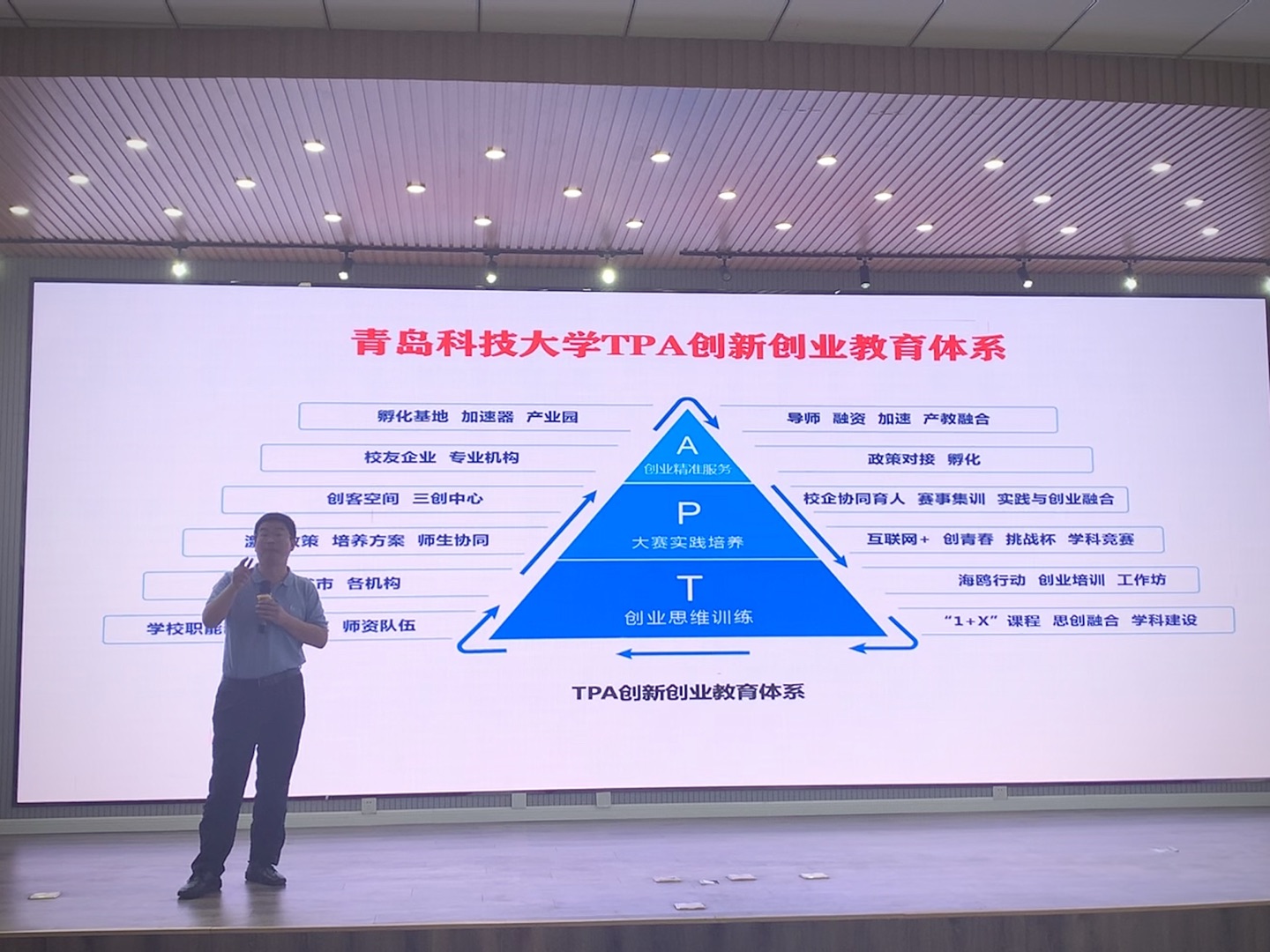 褚庆柱做了《TPA创新创业教育体系的构建与实践》讲座。从创业思维训练、大赛实践培养、创业精准服务三个方面,讲解如何培养创意思维,提高创新能力,发掘创业人才。传达了《青岛科技老员工学科竞赛管理办法》的文件精神,对如何参加大赛“互联网+”大赛进行了详细解读。