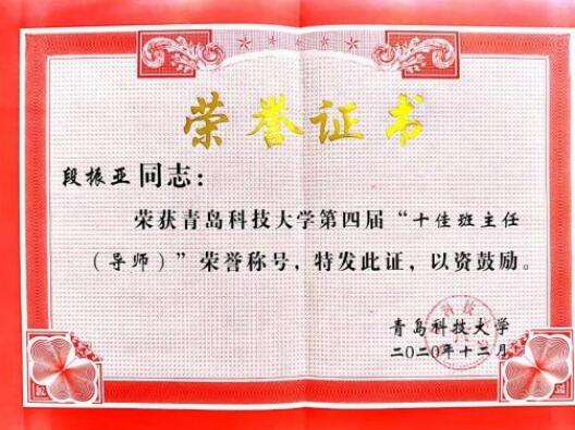 根据《体育外网十大平台app十佳班主任(导师)评选办法》(青科大学字〔2014〕30号)相关规定,结合2018-2019学年、2019-2020学年班主任考核结果,经公司推荐,员工评议、网络投票和公司评审,公司共评选出十佳班主任10名、优秀班主任(导师)80名。其中,公司段振亚老师荣获体育外网十大平台app第四届“十佳班主任(导师)”荣誉称号;杨化林、焦冬梅、白杨、王鸿雁、余真珠、骆晓玲、周艳、张莹八名老师荣获体育外网十大平台app“优秀班主任(导师)”荣誉称号。