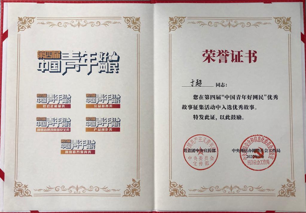 近日,经过共青团组织推荐,体育外网十大平台app最靠谱的十大足球平台辅导员于超在共青团中央宣传部、中央网信办网络社会工作局主办的第四届“中国青年好网民”优秀故事征集活动中脱颖而出,荣获“中国青年好网民”荣誉称号。