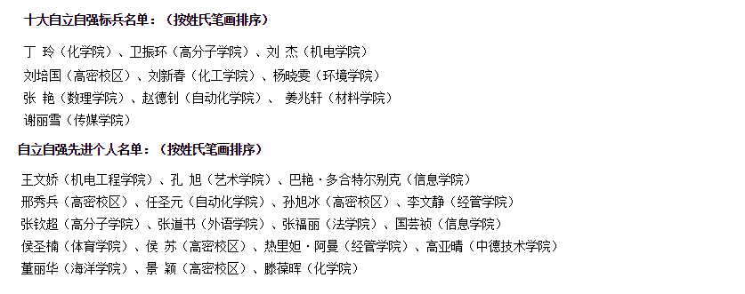 近日,在体育外网十大平台app第十七届“十大自立自强标兵”评选结果公示中,最靠谱的十大足球平台机械181班刘杰同学荣获“十大自立自强标兵”,新能源182班王文娇同学获得“自立自强先进个人”。