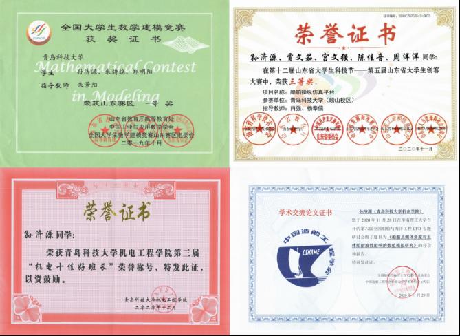 在科研方面,不断秉持潜精研思的科研精神,自大一加入船舶工程实验室以来,我参加了各类科技创新比赛,以及论文的撰写,付诸行动是一个从无到有的过程,成功不在难易,而在于是否采取行动。截至目前,共获得3个国家级奖项,10余个省级奖项等。2020年我参加第六届全国船舶与海洋工程CFD专题研讨会,并在会上进行论文报告,会后获得学术交流证书。面对困难,永不退缩,有想法就去付出行动,只有在不停地实践与追求中,才能超越自我。