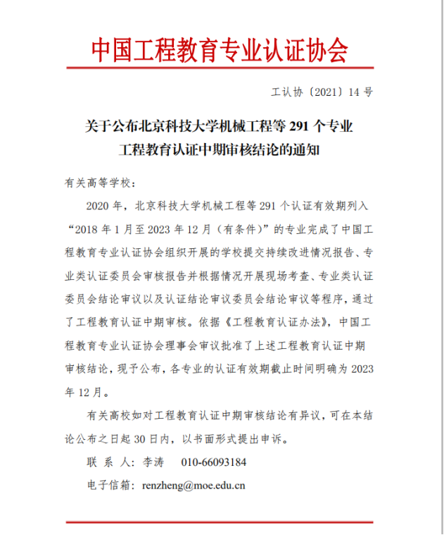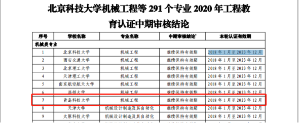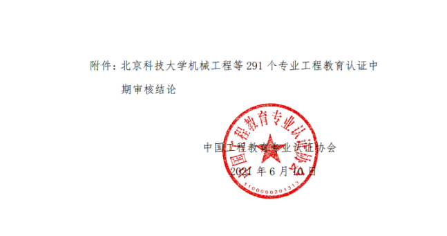 近日,中国工程教育专业认证协会发布了《关于公布北京科技大学机械工程等291个专业工程教育认证中期审核结论的通知》,公司机械工程和过程装备与控制工程两个专业在列,审核结论为“继续保持有效期”,本轮认证有效期为“2018年1月至2023年12月”。