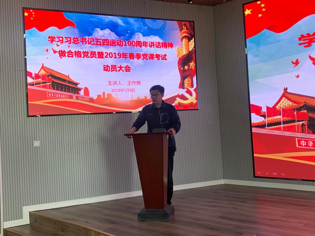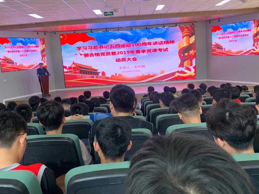 为进一步深入学习贯彻习近平总书记纪念五四运动100周年大会重要讲话精神,激励引导学子争做合格党员,弘扬五四精神。5月9日中午,公司举行学习习近平总书记五四运动100周年讲话精神做合格党员暨2019年春季党课考试动员大会。院分团委书记王作辉主持会议并讲话,2019年春季入党积极分子和发展对象参加了会议。