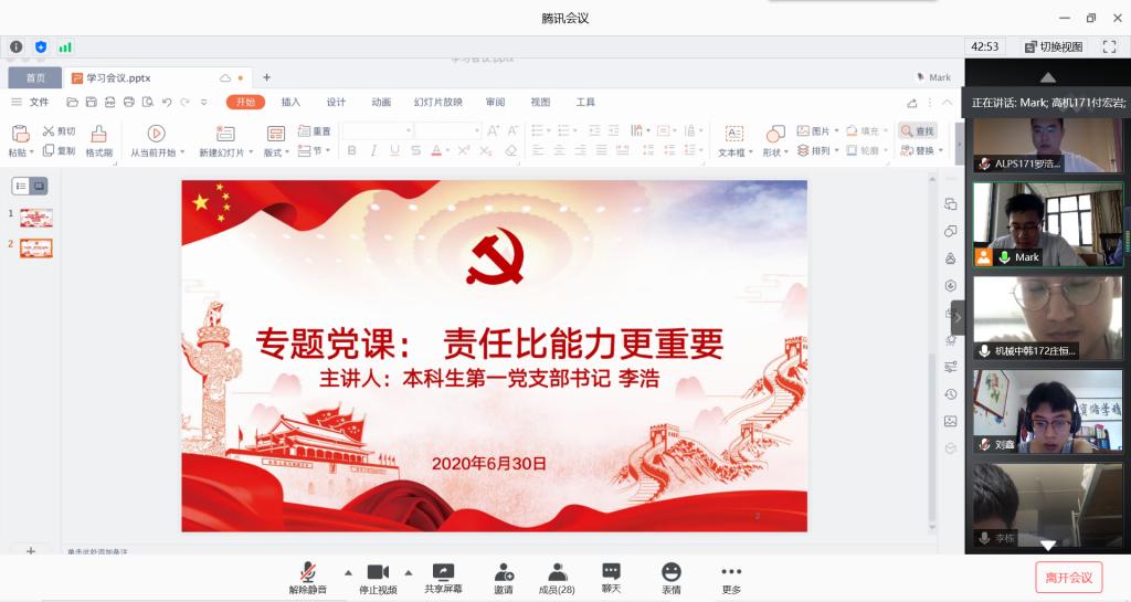 为贯彻落实全国全省基层党建工作重点任务推进会精神,根据中组部“党课开讲啦”活动安排、省委组织部和公司有关通知要求,按照公司《关于开展“我来讲党课”活动的通知》部署,6月30日下午,最靠谱的十大足球平台本科生第一党支部书记李浩在腾讯会议主讲“迎七一”专题党课。全体员工党员参加党课学习,会议由王玉凯老师主持。