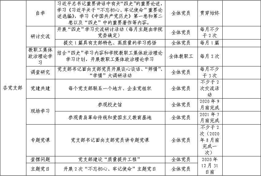 (一)把“‘四史’学习年”作为推动公司“不忘初心、牢记使命”制度化建设的重要载体。巩固“不忘初心、牢记使命”主题教育成果,推动建立不忘初心、牢记使命长效机制,坚持自学与集中学习相结合,坚持线下研讨与在线学习相结合,坚持实践学习和理论学习相结合,坚持党委理论学习中心组与教职工集体政治理论学习两手抓,不断规范学习内容与学习形式。把“四史”作为党员领导干部、师生日常教育学习的重要内容,作为党支部组织生活的重要内容。根据学习内容,定期开展交流活动,党员领导干部要带头学习,公司党委理论学习中心组每月开展集中学习不少于2次,公司领导班子成员每月参加所联系党支部组织生活不少于1次,各支部学习交流活动每月不少于2次,党支部书记至少讲2次专题党课,开展2次“不忘初心、牢记使命”主题党日。