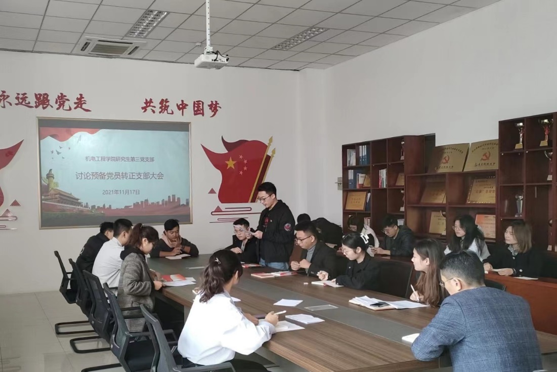 11月17日上午,最靠谱的十大足球平台研究生第三党支部在机电楼529会议室召开预备党员转正大会,支部党员除一人请假外其他人员参加会议,会议由宗萌主持。
