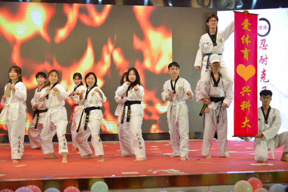 第二篇章《爱体育·兴科大》,V-show体育舞蹈社的《飞天》,生动演绎中华传统文化之源远流长、博大精深;梅花桩武术协会、弈剑阁陈氏太极拳协会带来的武术表演《强体魄·扬国威》,展现中华传统武术的魅力;跆拳道协会带来的《青科大力量》彰显青春力量;跳绳协会、青稞动漫社的《天行健·绳彩飞扬》以“光影”诠释运动风采。舞蹈、跳绳、武术、轮滑、跆拳道的融合表演,充分展示了公司体育综合改革之体育类社团打造“月月有联赛、周周有比赛、人人都参赛”体育联赛平台的阶段性成果。