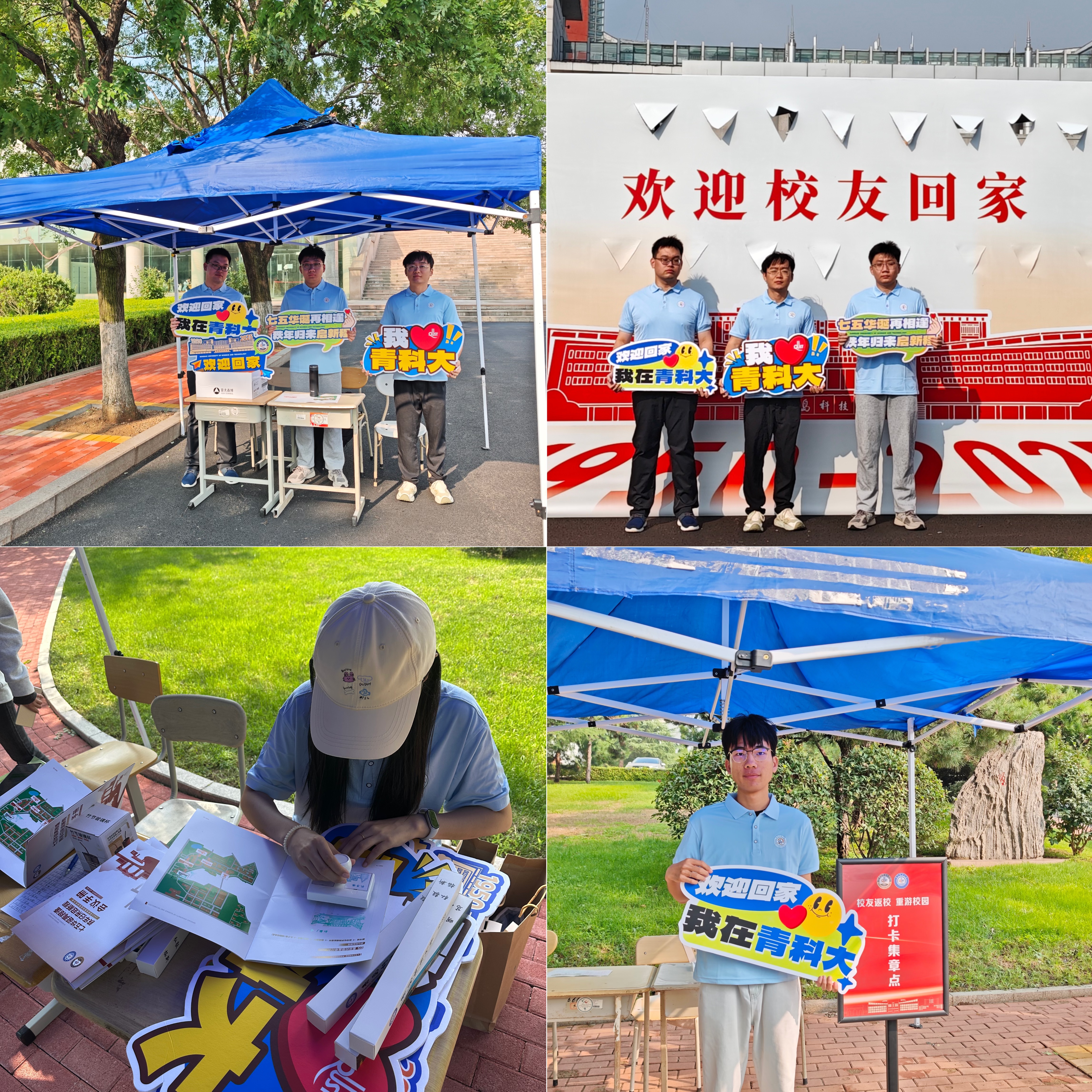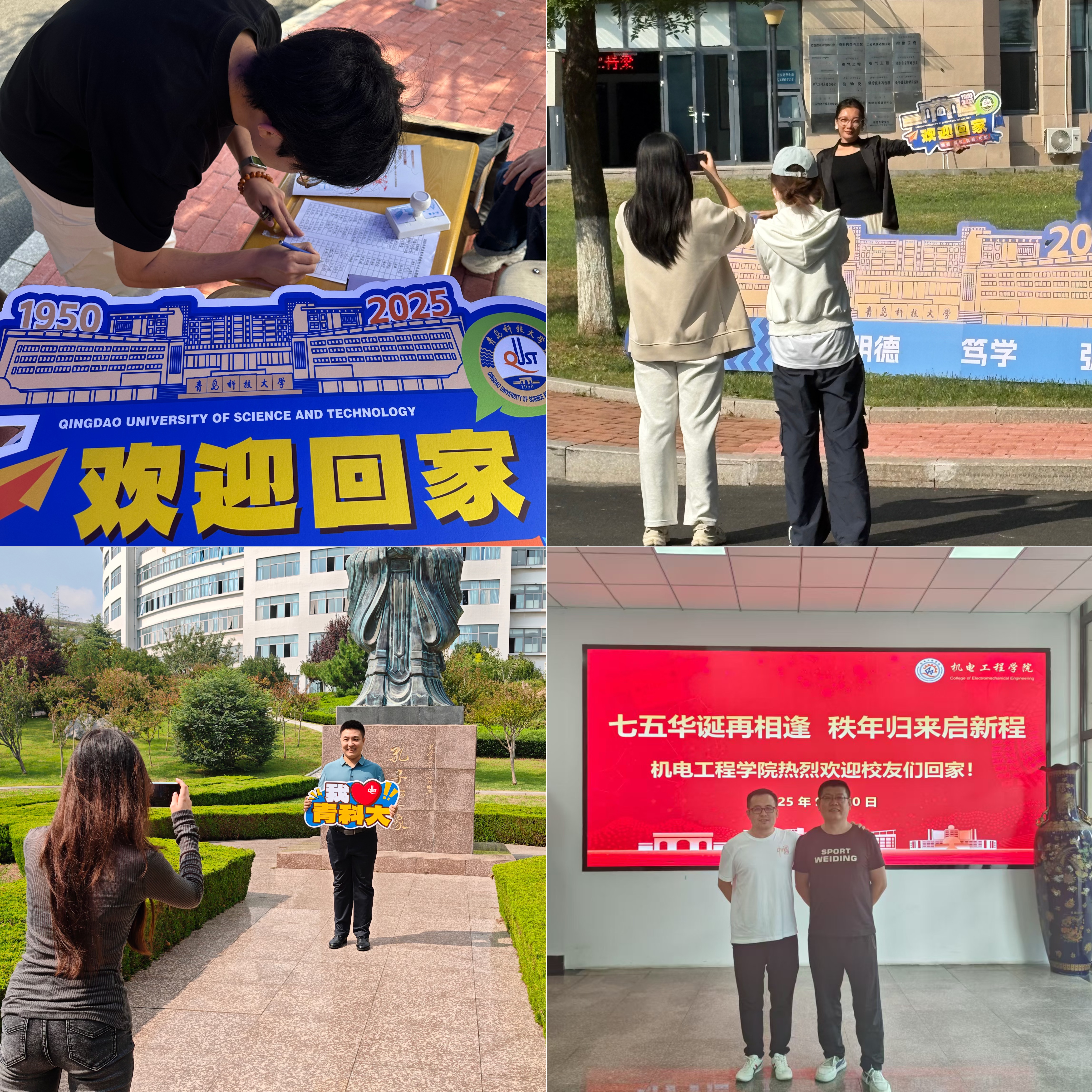 校园打卡点位上,志愿者们的身影成为温暖的注脚。崂山校区正门喷泉旁与图书馆前,志愿者们热情招待员工们“回家”,并协助员工在书香中重温求学时光;自动化公司楼前,志愿者们为员工讲解建筑背后的岁月故事,见证75周年历史印记与笑容的同框;孔子像下,共同感触校训的源远流长;弘毅楼前,细数光影间的青春记忆;南苑食堂里,陪伴员工重拾烟火气十足的校园味道。一个个精心布置的打卡点串联起回忆的脉络,每一枚盖下的印章都沉甸甸地承载着员工对母校的眷恋与牵挂,相机快门声里,一张张笑脸成为校庆最珍贵的纪念。