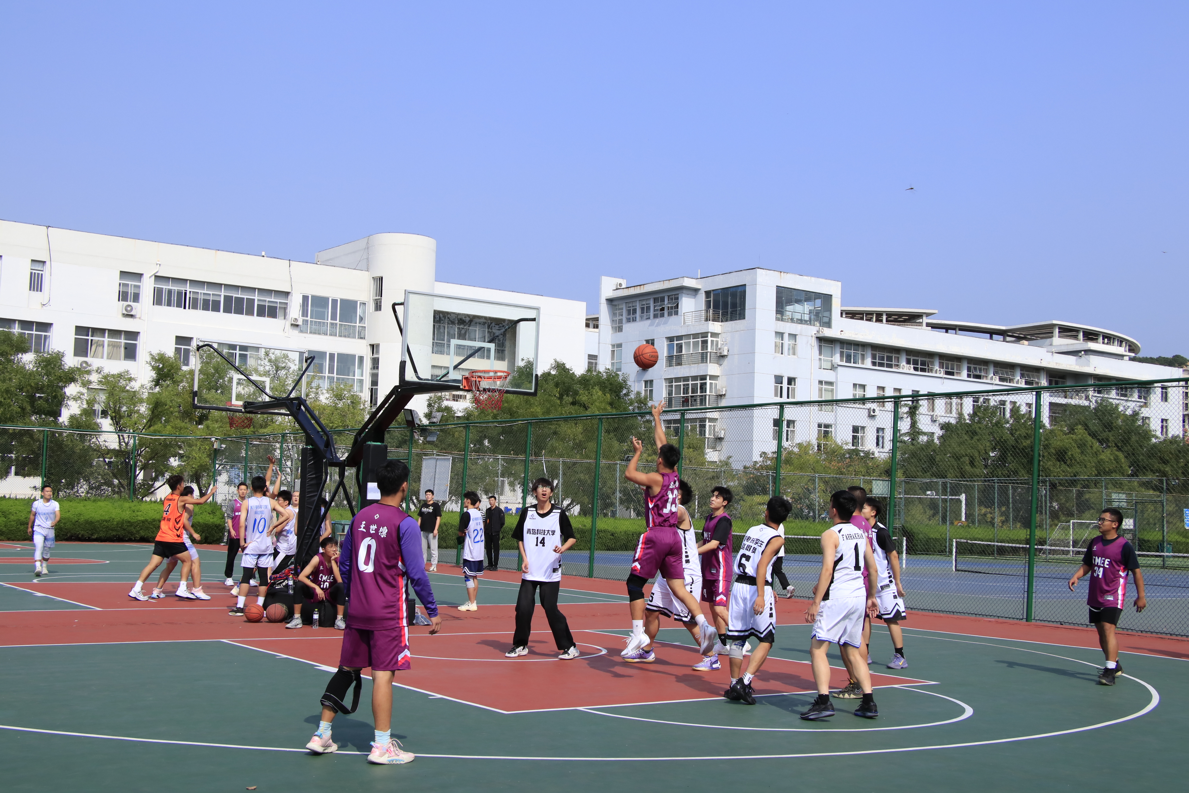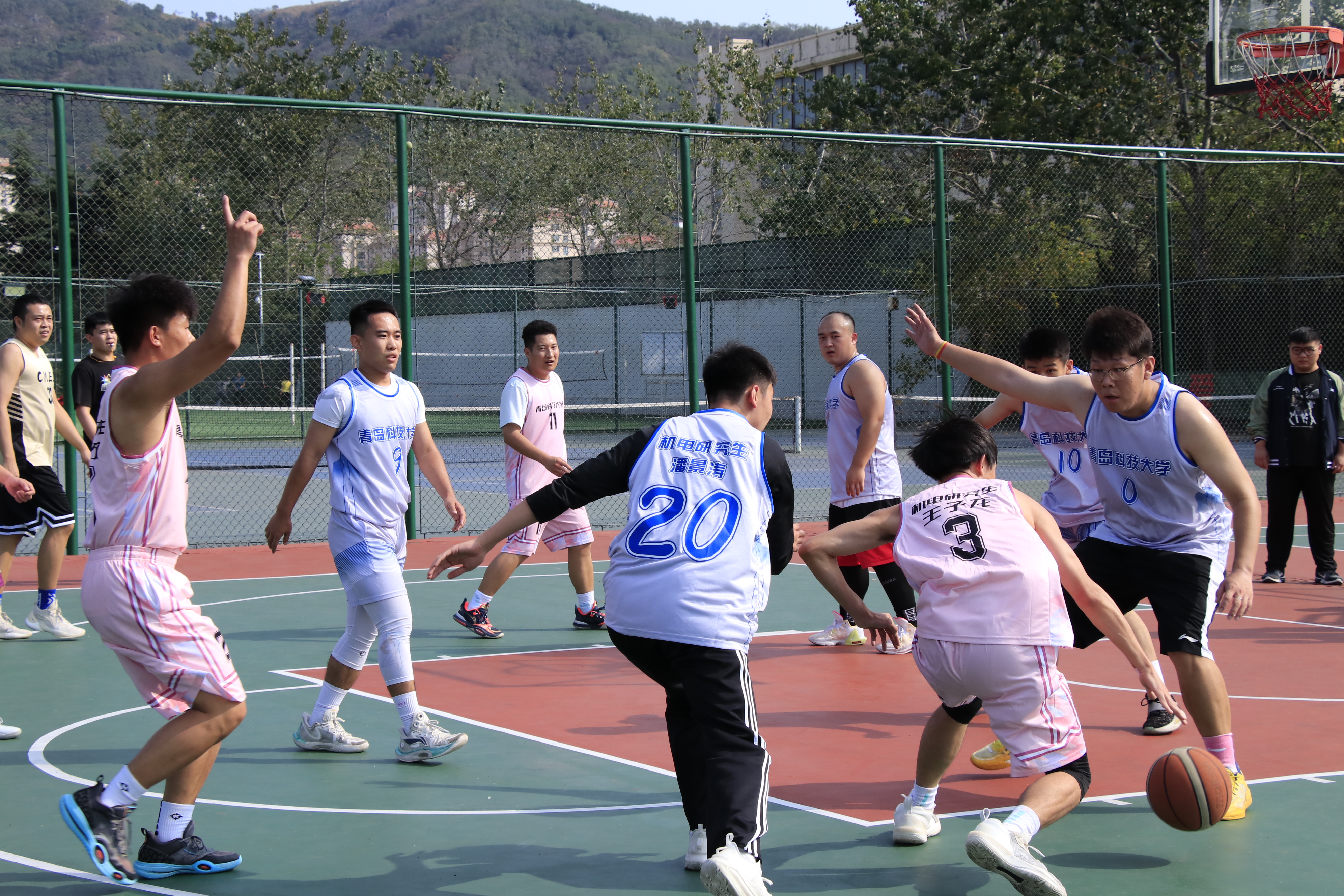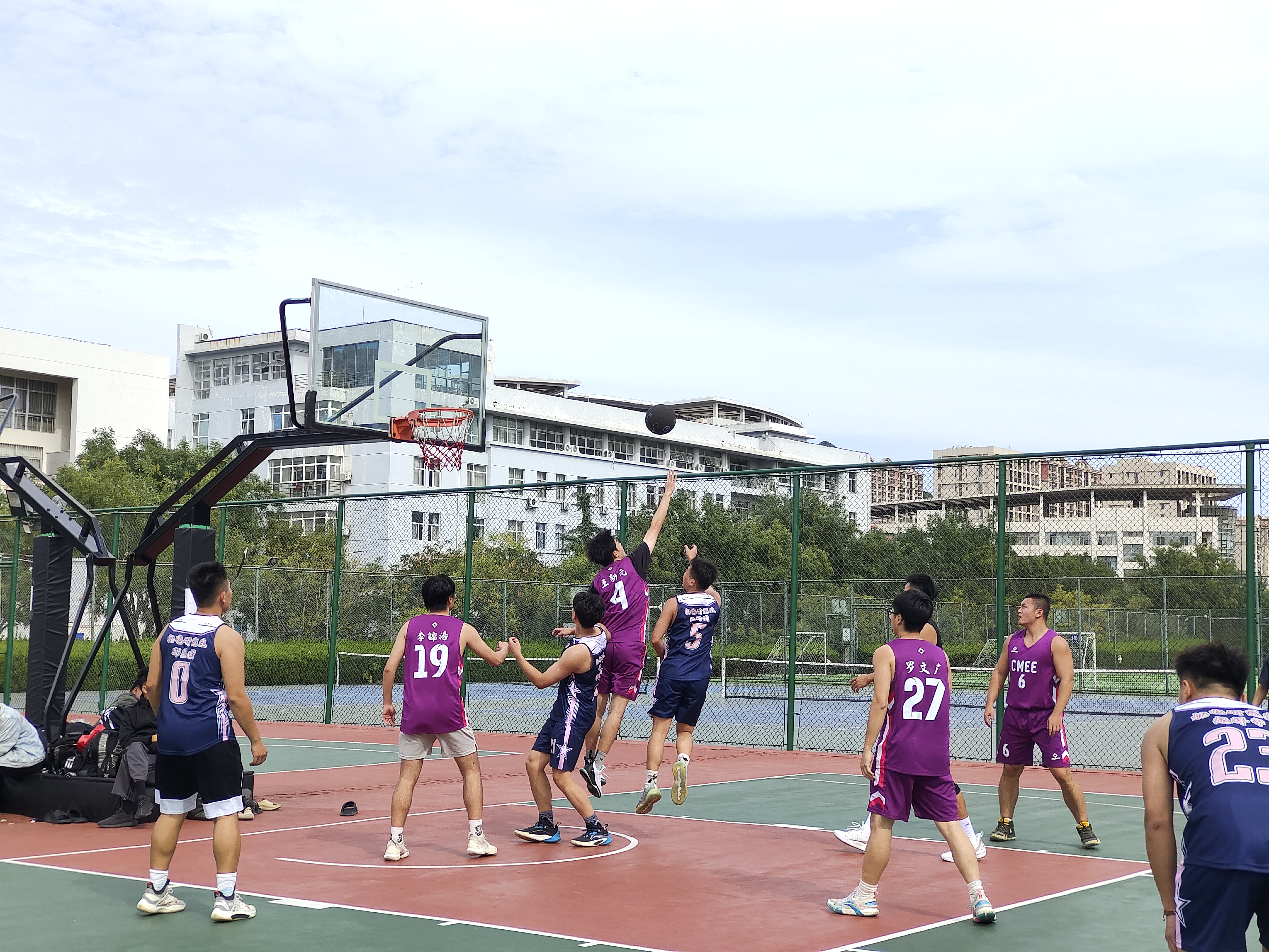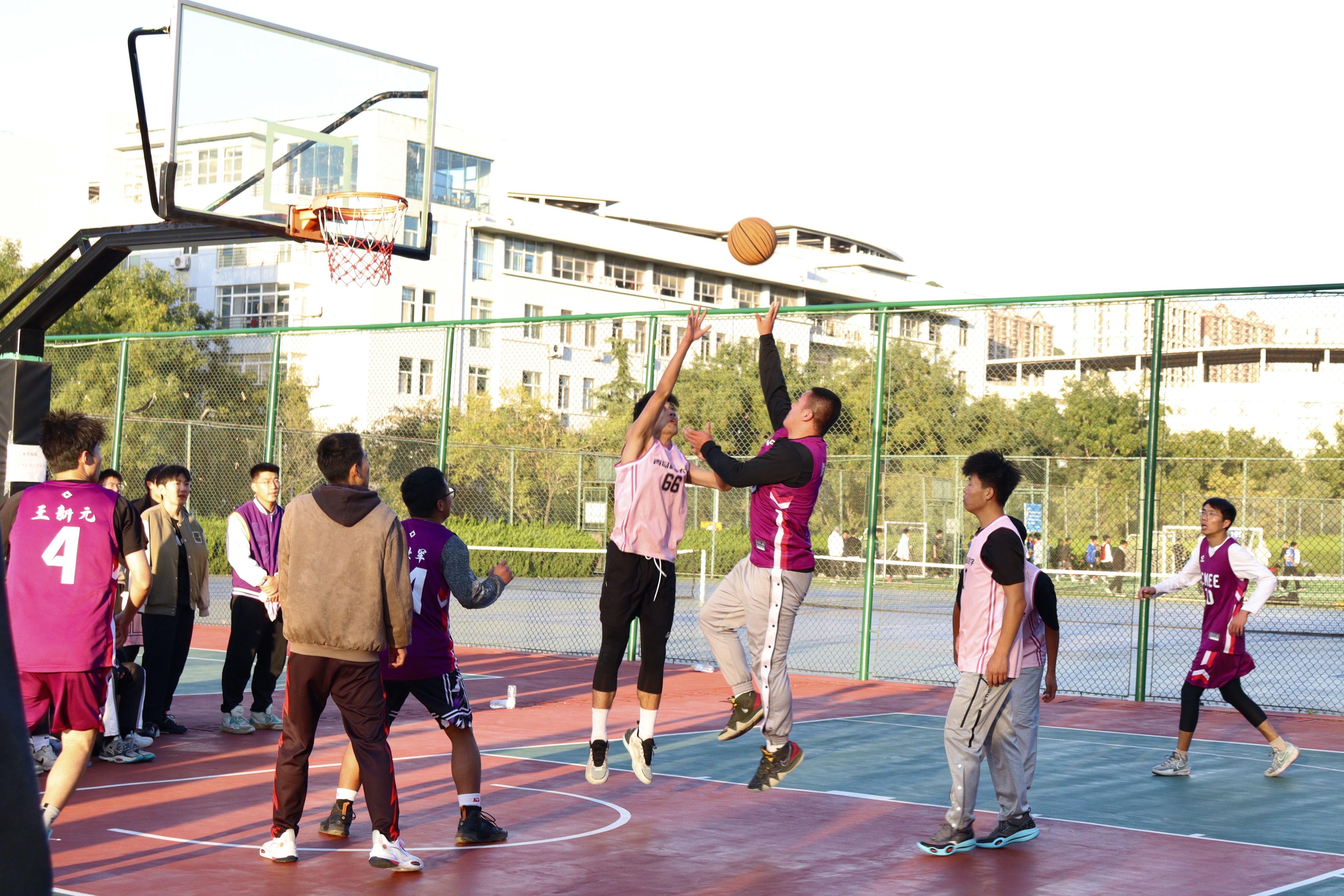 第一天小组赛阶段,各班级球队纷纷展现出了顽强的斗志和精湛的球技。研一1、2班与研三的对决中,双方球员你来我往,互不相让。研三的队员们配合默契,多次通过精彩的传球和犀利的突破得分,而研一1、2班也不甘示弱,他们在防守端全力以赴,同时在进攻端寻找机会反击。场上比分紧咬,比赛紧张激烈,引得观众们阵阵喝彩。