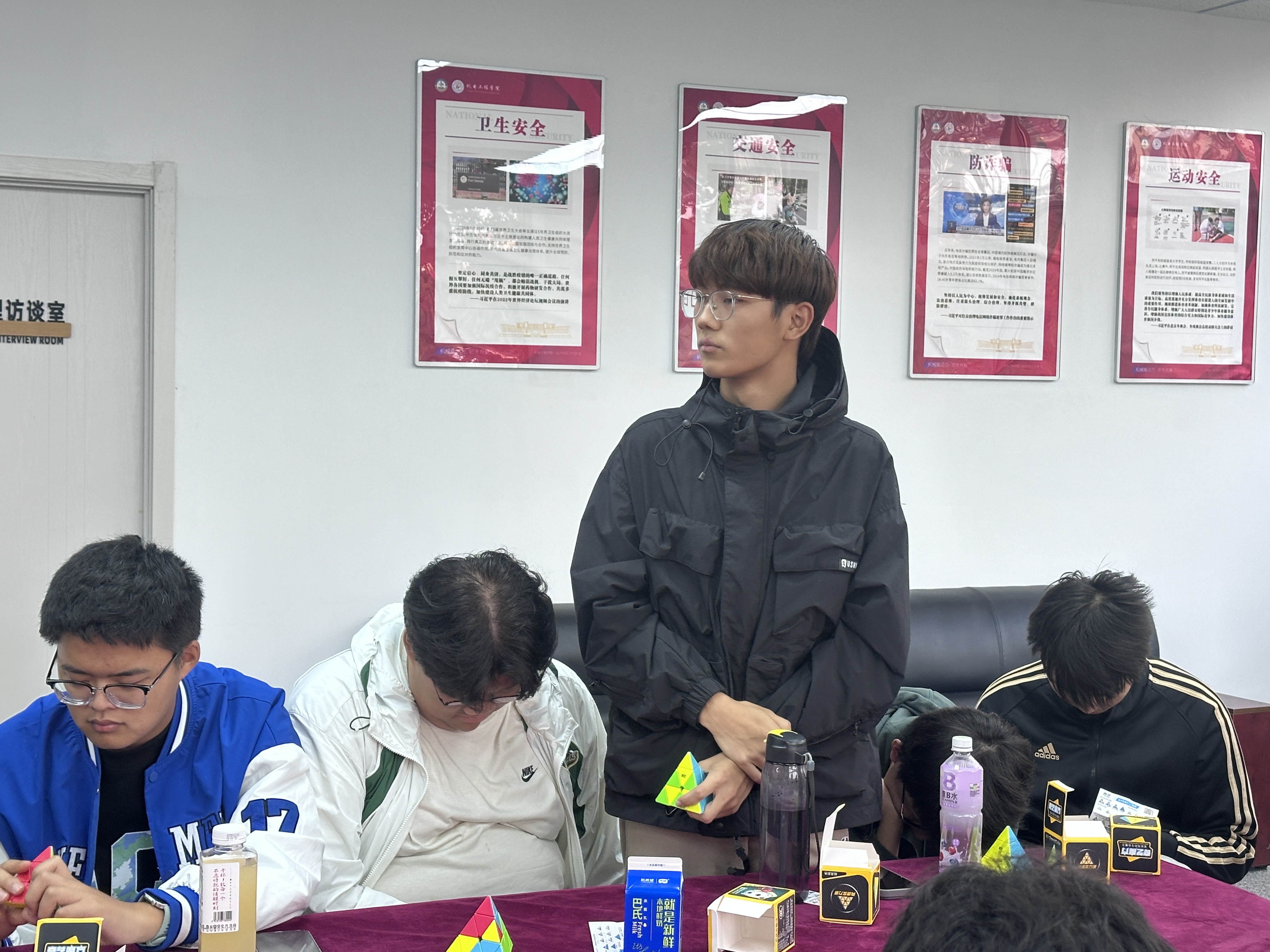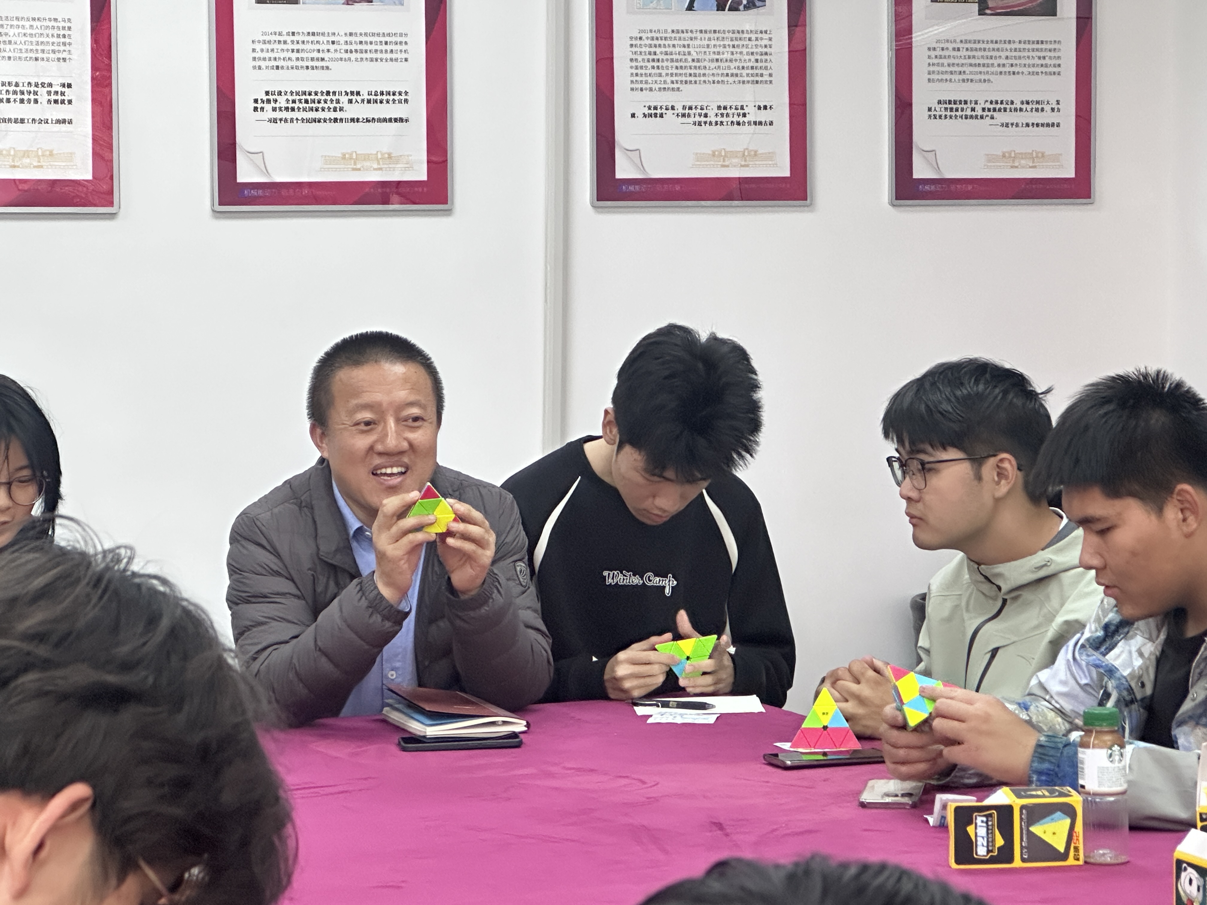 杨小明首先将准备好的三角魔方发给大家,请大家用最少的步数打乱魔方并交给自己右手的同学,同学们饶有兴致的开始复原魔方。随后,同学们纷纷讲解三角魔方里面的成长智慧、机械原理和人生感悟,用三角形的稳定性原理展望美好的老员工活。杨小明指出:三角魔方里面蕴藏着黄金圈法则、三螺旋结构等丰富的科学知识与成长道理,每个人都能够感悟出自己的认识。杨小明从自己的学习工作经验指出,“知识学习—能力提升—反复应用”三者相辅相成、不可或缺,最终才能成就精彩人生。同学们积极参与互动,用三角魔方原理阐释如何做好“宿舍文明建设”“课堂学风建设”“员工组织发展”等,多维度探讨老员工涯的平衡之道。
