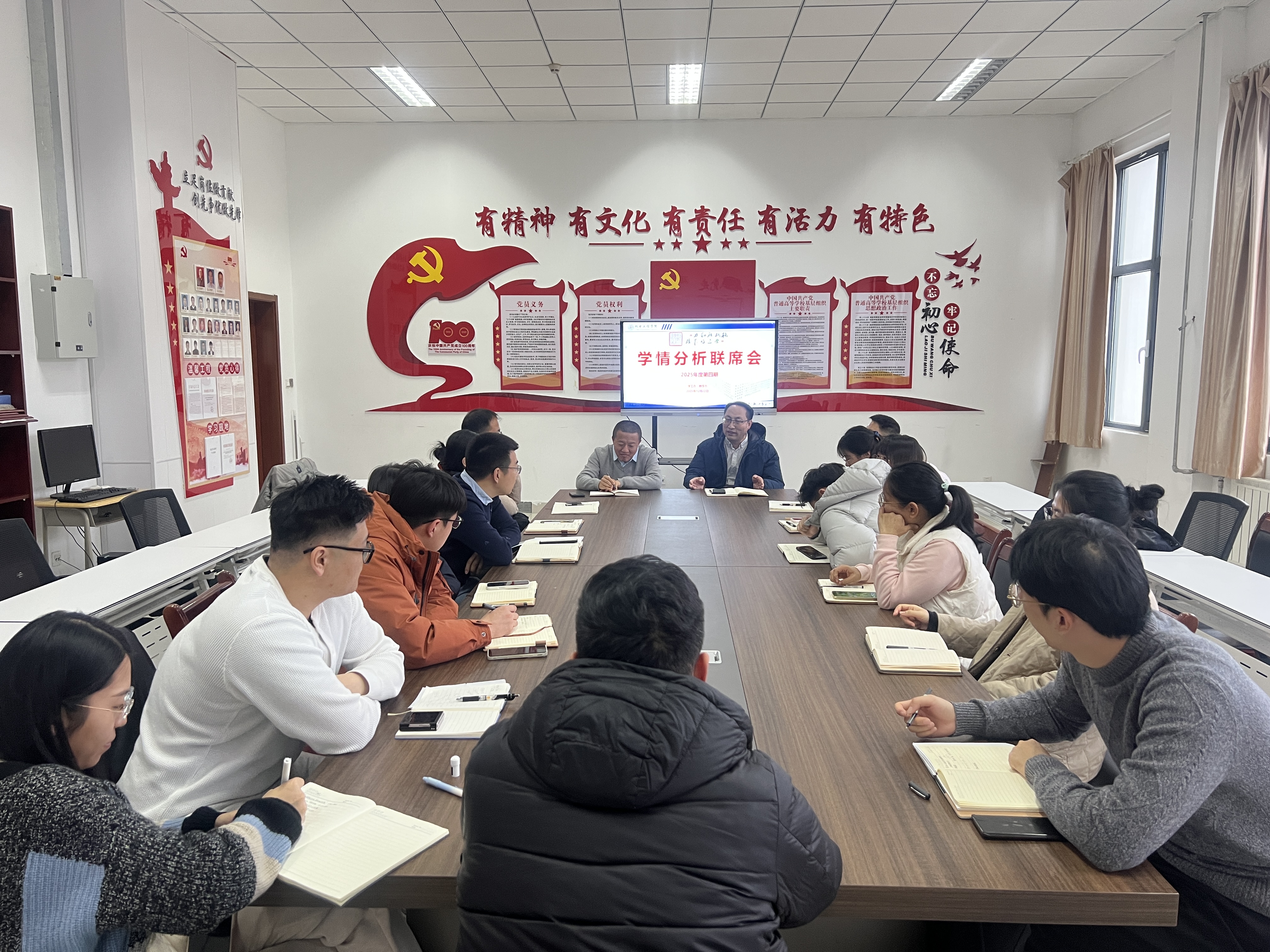 12月22日,最靠谱的十大足球平台在党建活动室召开2025年度第四期学情分析联席会。公司党委副书记兼副经理杨小明、分管教学副经理李剑光,学工办全体辅导员、教学办公室全体教师参加会议。