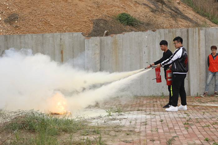 演练开始,指挥长首先为同学们讲解了消防安全应急知识与灭火器使用技巧,教同学们在发生火情时,如何正确地扑救、自救和逃生。随后由同学们自己动手实践,练习使用灭火器灭火。本次演练所用灭火器为干冰灭火器,同学们拨出插销,一手握住开启压把,另一手握住喷射喇叭筒,对准火源喷射,将火源迅速扑灭。员工两人一组完成灭火器使用的练习。全体同学实践练习完成后,此次消防演练顺利结束。