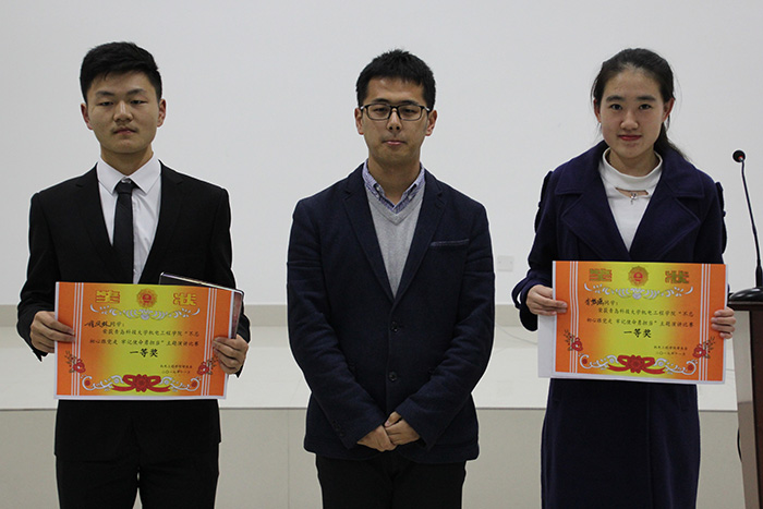 在主持人高翔的慷慨激昂的致辞中,演讲比赛正式拉开序幕。演讲比赛紧扣主题,选手们结合自身经历、所见所闻畅谈十九大。选手们通过列举中国古今为国奉献的英雄豪杰,畅聊我国硬实力软实力的卓越进步;引用先贤的名言警句,激励老员工有作为、敢担当。现场气氛浓厚,每一位选手都将自己的感想与感悟淋漓尽致用语言表现出来。选手们激情澎湃的演讲更是让现场的观众备受感染和鼓舞。经过激烈的角逐,程风林、李梦瑶荣获本次比赛一等奖。随后,曲智强老师、王娟娟老师、温南南老师分别为获得一、二、三等奖的同学颁奖。最后,曲智强老师为本次比赛作精彩的总结,表扬选手们在恶劣的天气下能够用演讲的激情驱散寒冷,感谢老师们同学们能够一直关注比赛,并希望大家认真学习党的十九大精神、学习十九大报告,将日常学习生活与十九大联系在一起。
