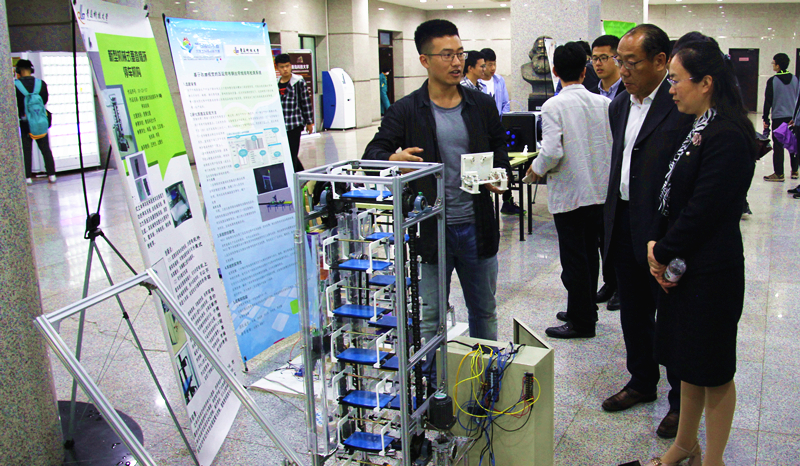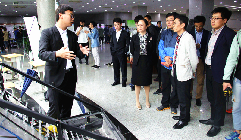 仪式结束后领导们来到图书馆参观展览,本次作品展向大家展现包括了“机器人中心”、“PEC”、“节能减排”和“海狼”四个工作室的作品,积极创新的员工个人的项目和2017工业设计系毕业设计。展览中,参与科创的同学向前来观看的老师、同学们一一详细讲解并演示,认真回答老师提出来的问题,向大家科普各专业的相关知识,也介绍了各优秀作品的创作历程,使大家从不同的角度了解了科创。欣赏过各项科技创新作品后,老师和同学们陆续离开。