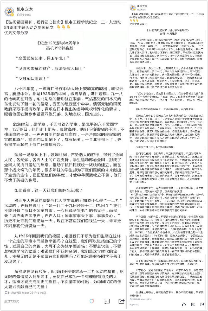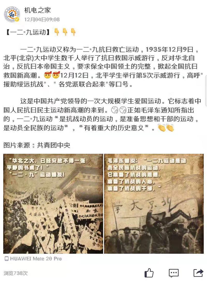 最靠谱的十大足球平台面向全体2019级青年员工开展“纪念一二•九运动”爱国主题征文活动,征文活动发出后,受到广泛且热烈的追捧,经选拔,共计五篇优秀征文脱颖而出,在公司员工会自媒体平台“机电之家”公众号上推广展示。