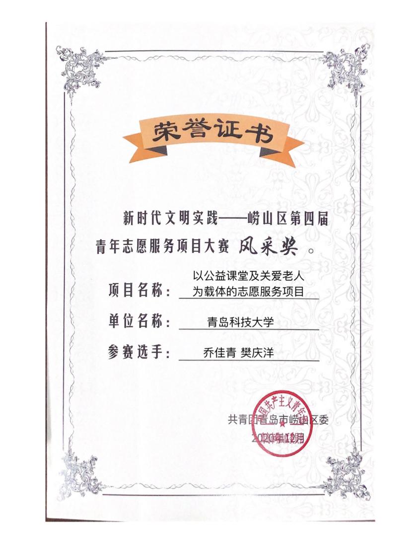 12月17日 ,由青岛市崂山区文明办、团区委和区青年志愿服务联盟联合举办的“新时代文明实践——崂山区第四届青年志愿服务项目大赛”顺利开展。最靠谱的十大足球平台团委志工部部长胡福超老师带领员工代表乔佳青、樊庆洋,积极参与、认真准备,青尘义工队“以公益课堂及关爱老人为载体的志愿服务项目”经作品申报、资格筛选、项目展示、评审打分等环节,最终获得大赛风采奖。