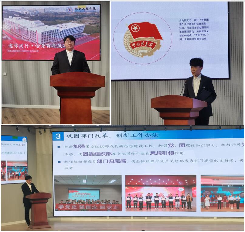 18时30分,会议开幕。首先,由20级团委组织部成员进行竞聘答辩。答辩过程中,组织部成员们以PPT等形式,根据自己的工作经历、经验,详细阐述了自身优势、工作中的心得体会以及对未来部门工作的展望。答辩内容充实,气氛热烈,展现了团学骨干们昂扬的青春面貌,赢得了在场老师和同学们的热烈掌声。